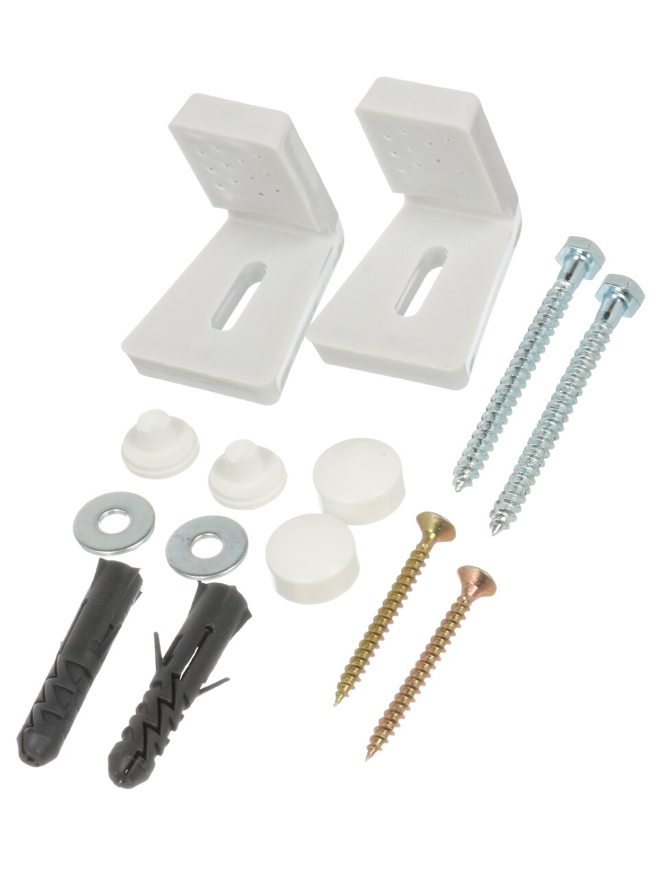 В комплекте: 2 шурупа 6х70 мм, 2 дюбеля 10х50 мм, 2 внутренних уголка, 2 самореза 5х50 мм под шлиц PZ 2, 2 декоративные заглушки. Это экономит время на поиски и гарантирует совместимость деталей.