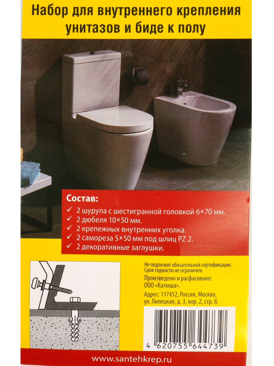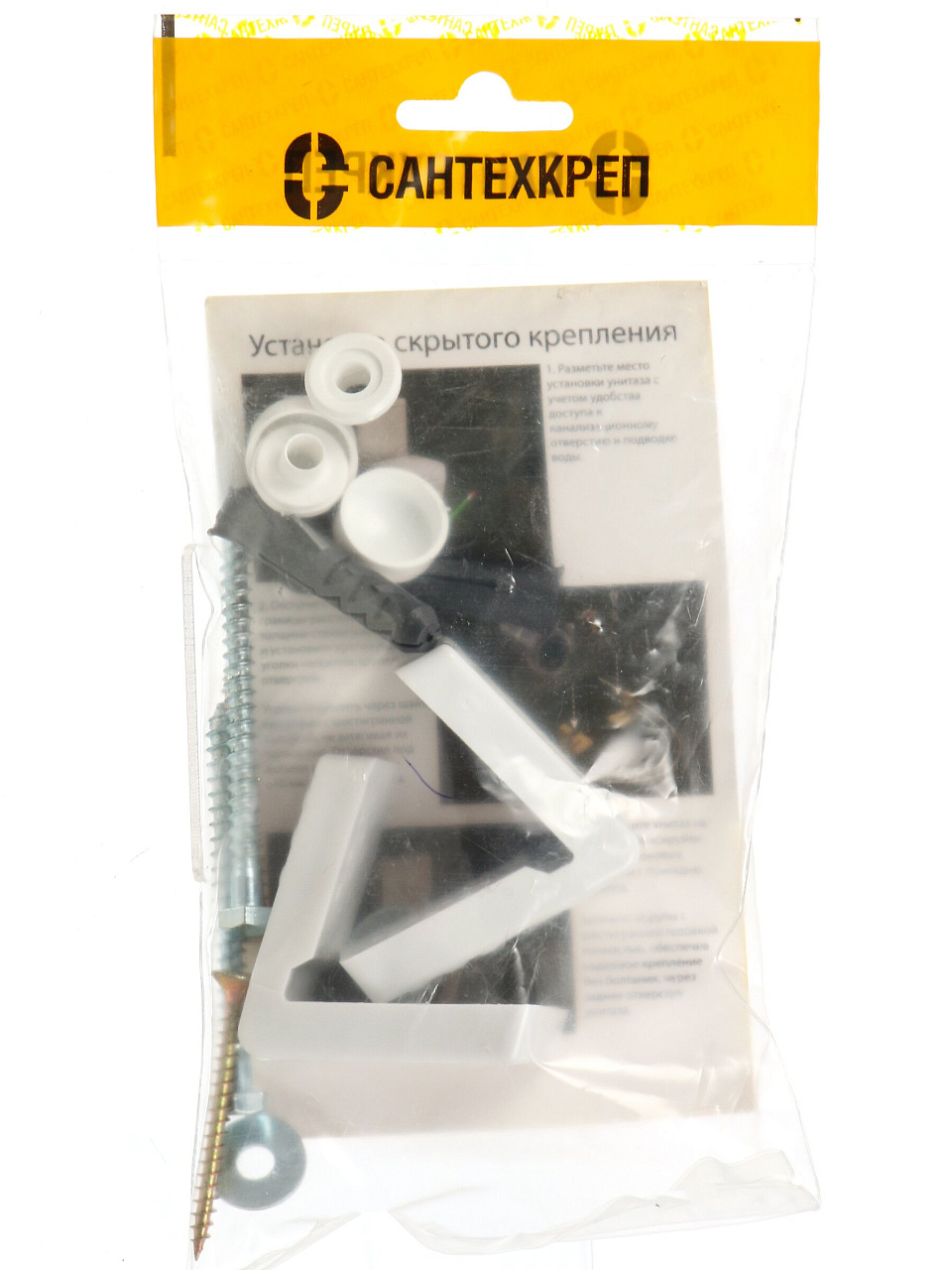 Внутренний крепеж СантехКреп включает все необходимые элементы стандартных размеров (шурупы, дюбеля, уголки, саморезы, декоративные заглушки) и подходит для большинства моделей унитазов и биде. Поставляется в фирменном пакете с подвесом — удобно для самостоятельной установки.