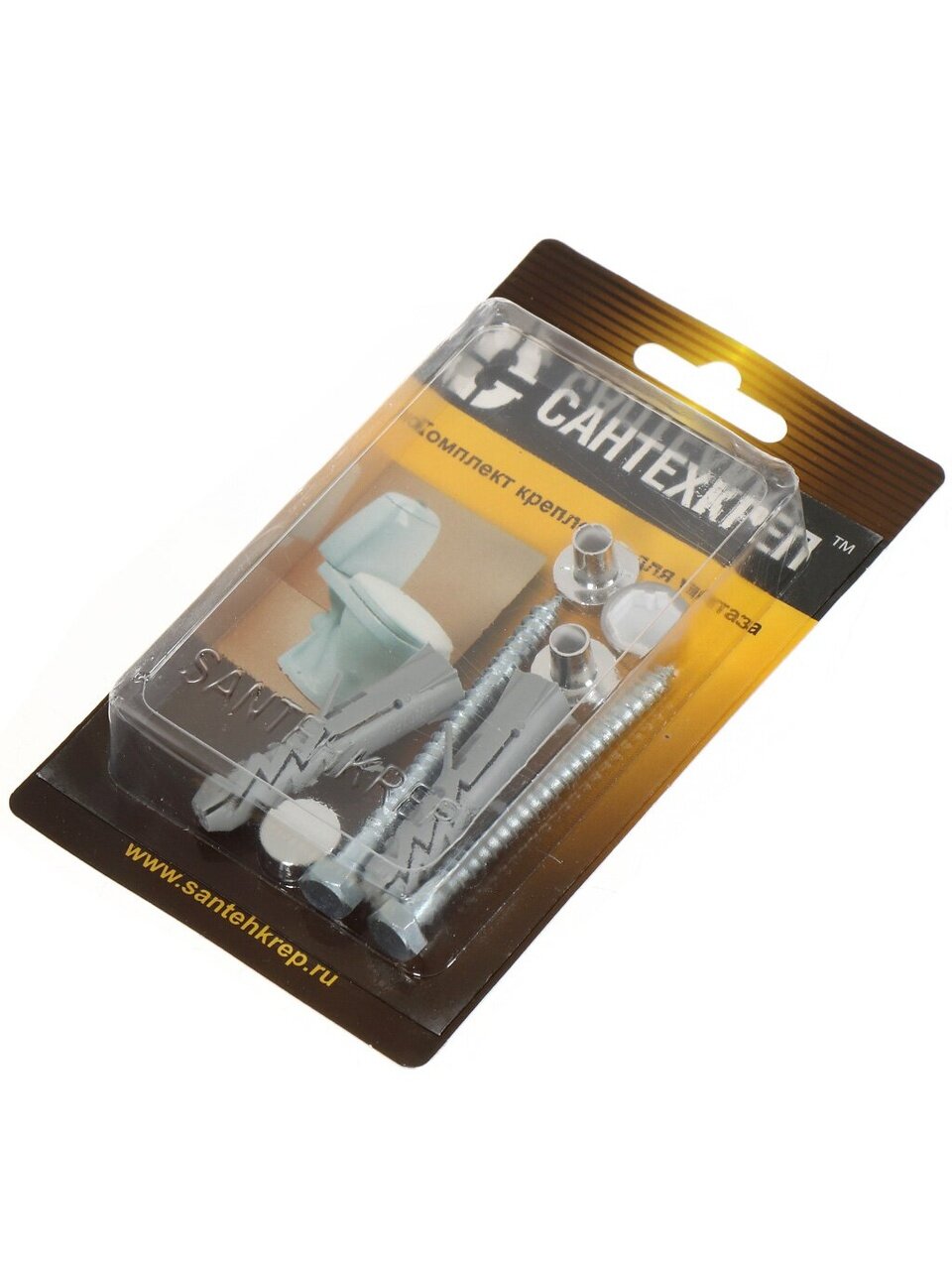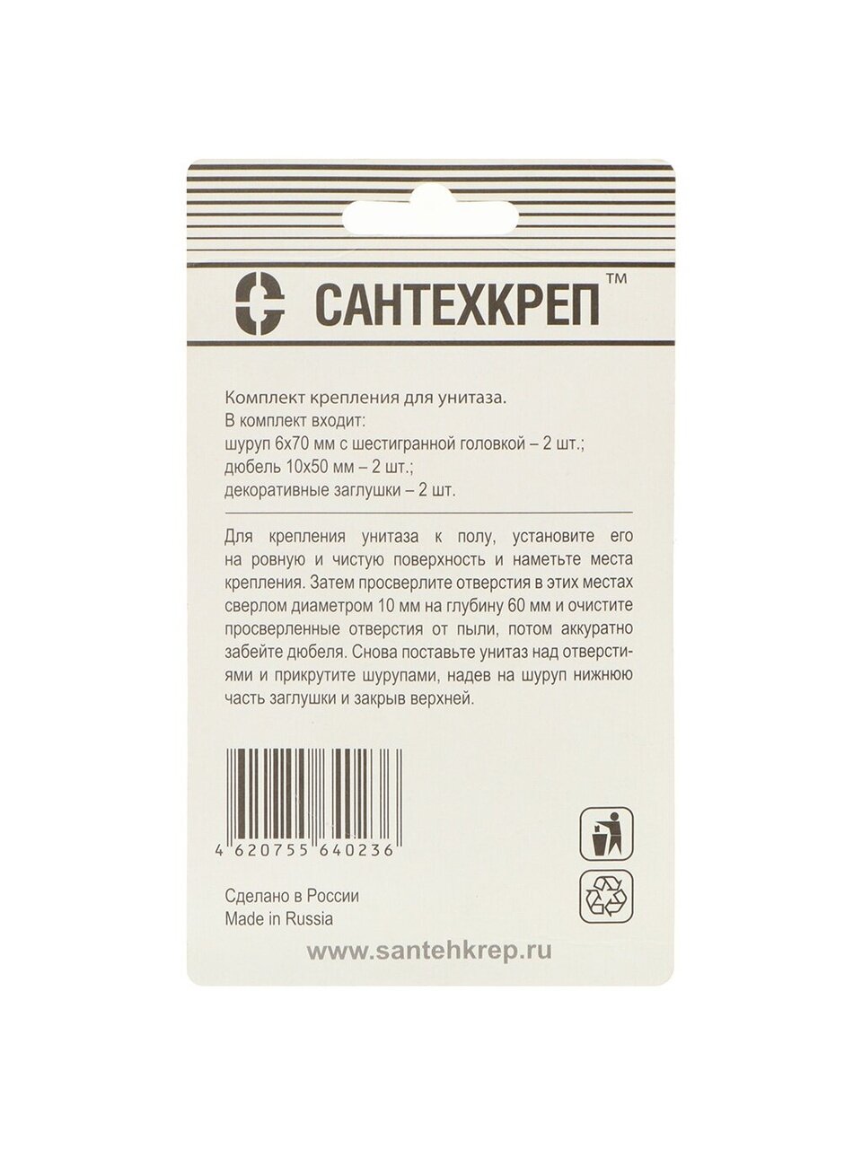 В наборе 2 крепления, упаковка — блистер. Производитель — СантехКреп, страна продавца — Россия. Артикул: 1.2.2. Совместимо с большинством стандартных унитазов.