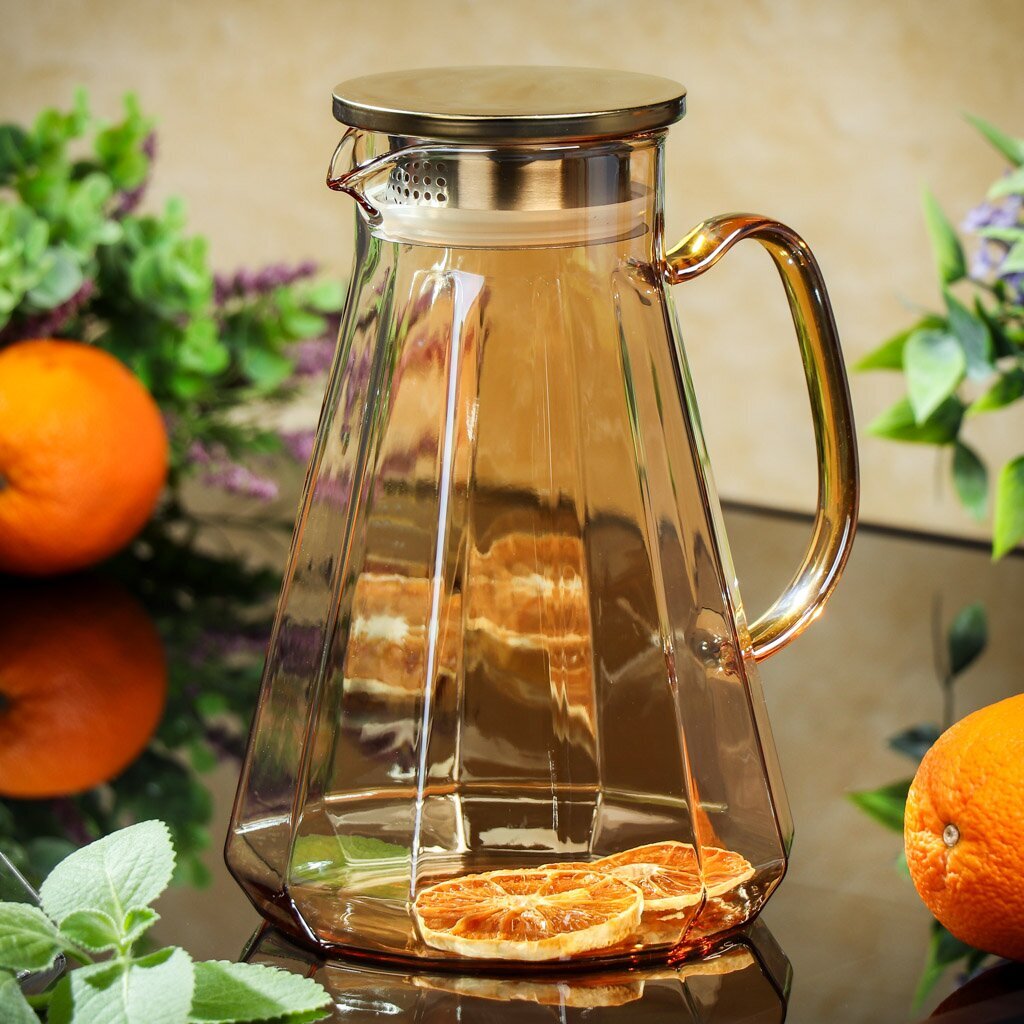 Стеклянный кувшин - полезный кухонный атрибут, который можно использовать в качестве ёмкости для Ваших любимых напитков. Данная модель кувшина изготовлена из стекла и выполнена в нежном золотисто-медовом цвете. Кувшин закрывается с помощью крышки, которая сохранит аромат и вкус Вашего напитка насыщенным. Станет прекрасным дополнением на Вашем повседневном, или праздничном столе, а также хорошим вариантом для подарка. Выполнен из термостойкого стекла и подходят для горячих напитков (чая/кофе).