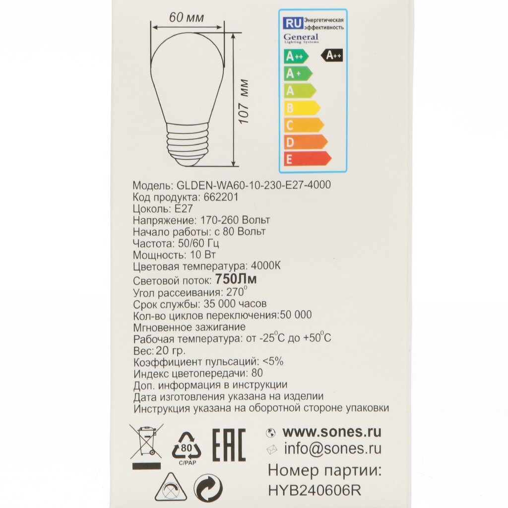 Планируете купить недорого светодиодную лампу E27 для дома или дачи? Модель GLDEN 662201 — это оптимальный выбор для тех, кто ищет баланс между экономией и качеством освещения. Лампа даёт ровный нейтральный белый свет (4000K), который не искажает цвета и подходит для всех жилых помещений. Световой поток 750 лм обеспечивает достаточную яркость для чтения, работы и отдыха.