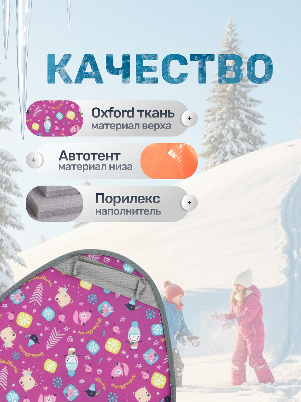 - Ткань Оксфорд - водоотталкивающая, устойчивая к морозам до -45ºС, шершавая поверхность, дополнительно повышает безопасность во время катания.