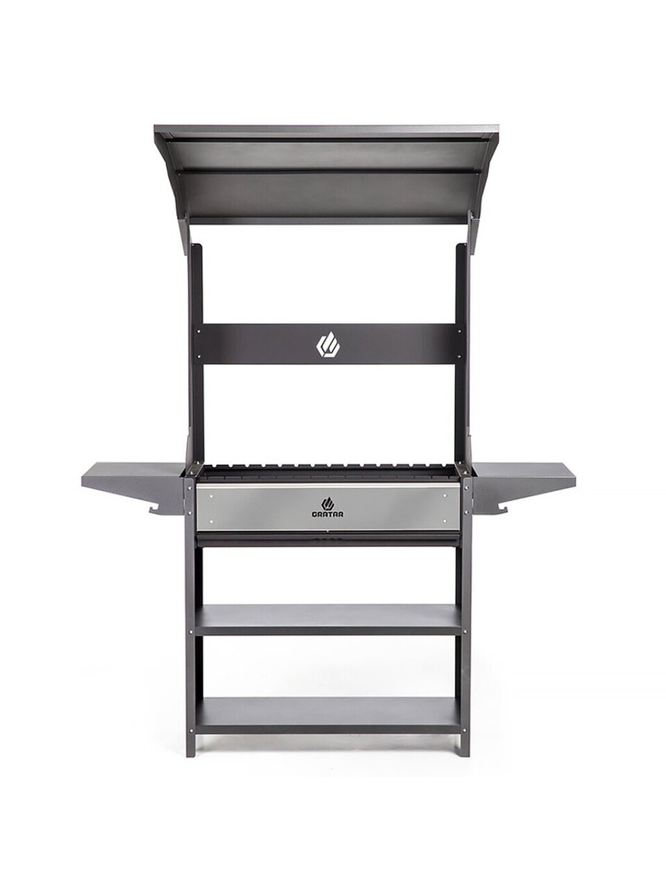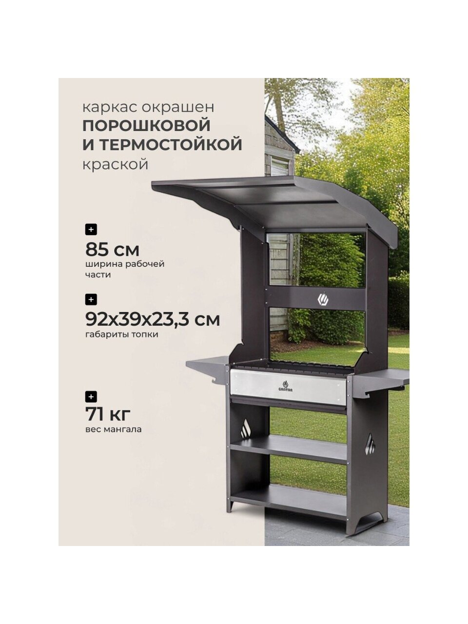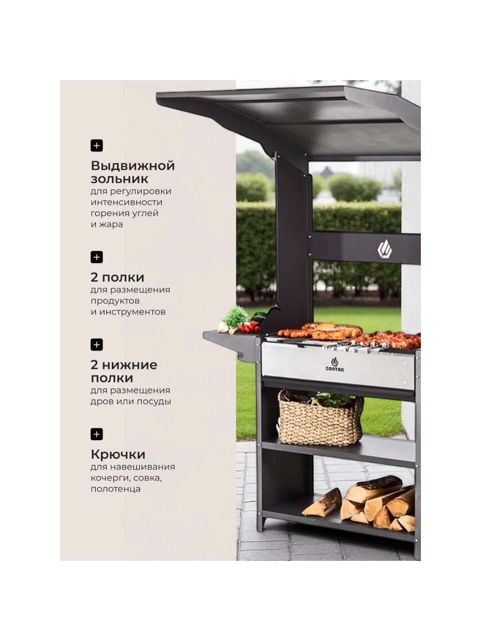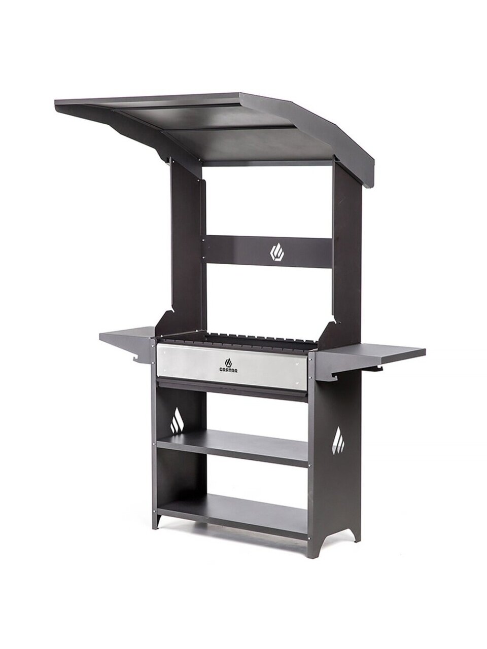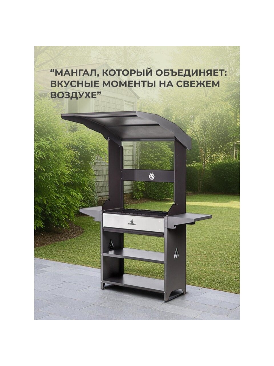 Долговечная разборная конструкция мангала Gratar обеспечит длительный срок эксплуатации. Панель из нержавеющей стали, которая установлена на лицевой стороне жаровни, выполняет функцию и термоизоляционного элемента, и декоративного. Мангал с боковыми столиками оснащен специальной высокопрочной объемной жаровней. Мангал не обязательно устанавливать под навесом или в беседке, крыша надежно прикрывает зону готовки. Под жаровней установлены две полки. Они могут служить дровницей, местом для инвентаря и посуды. Боковые столики вместительные, подойдут для раскладки продуктов. На крючках навешивают кочергу, совок или полотенце.
