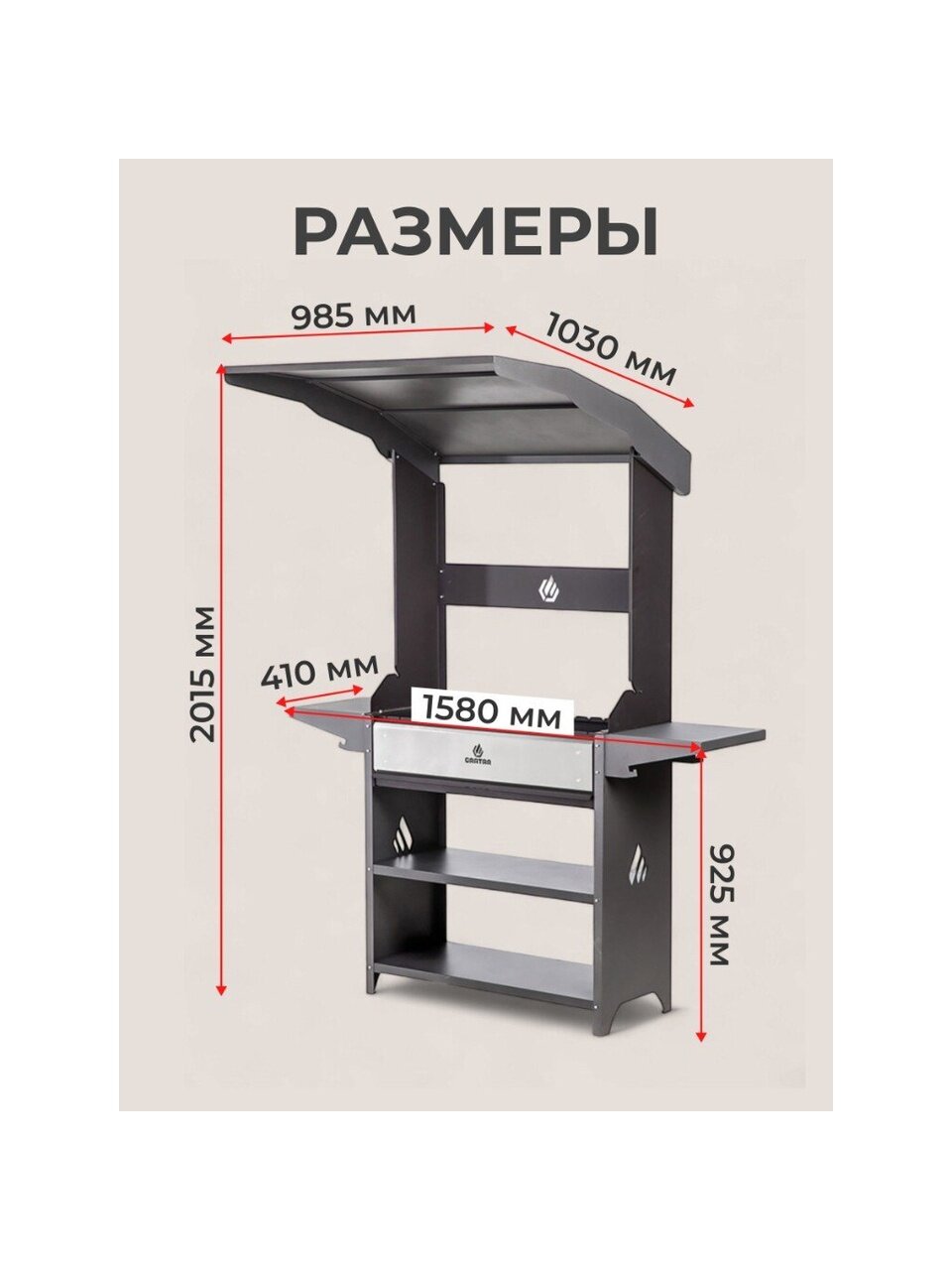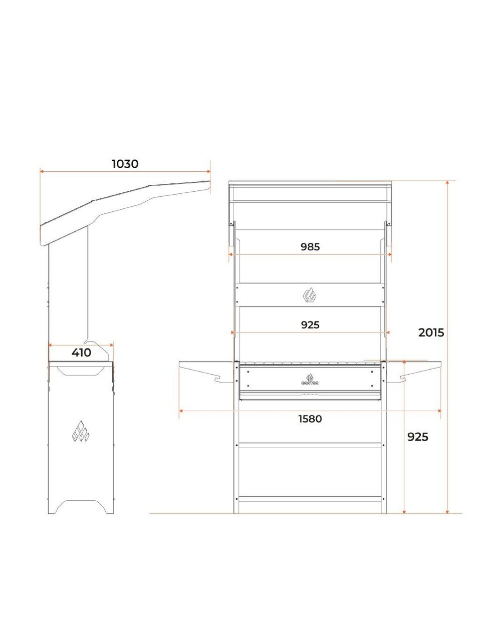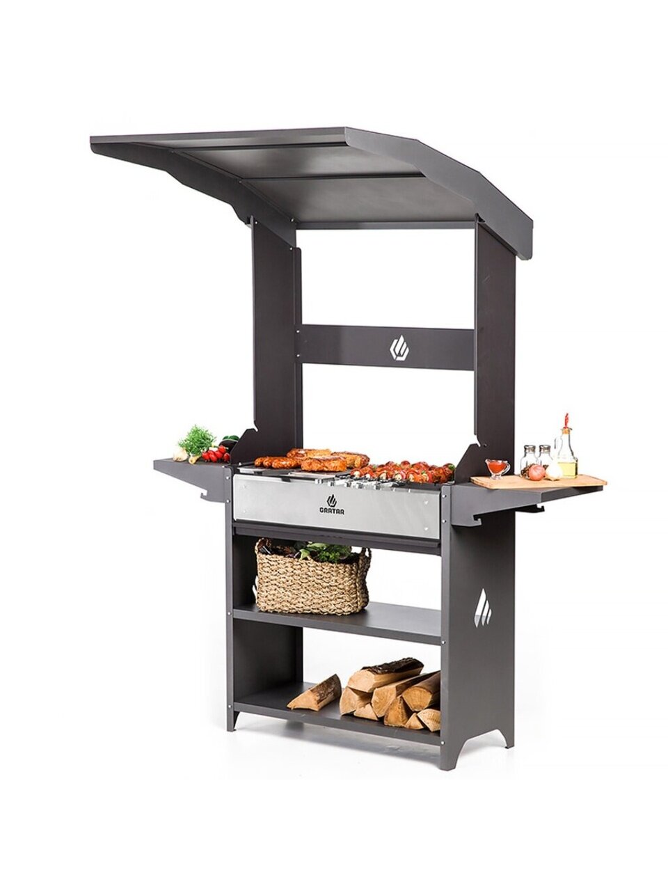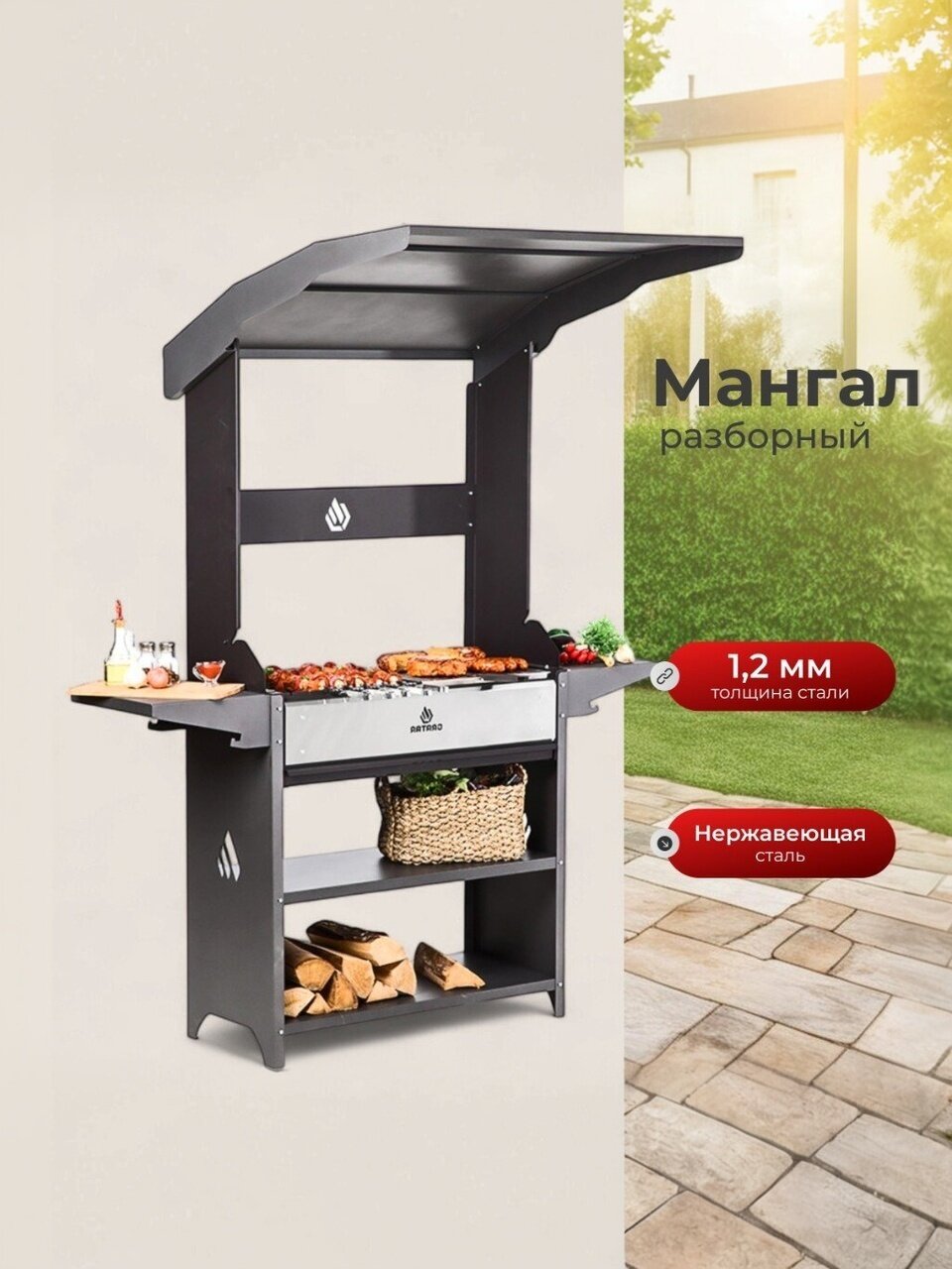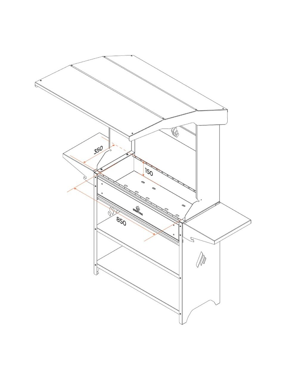 Долговечная разборная конструкция мангала Gratar обеспечит длительный срок эксплуатации. Панель из нержавеющей стали, которая установлена на лицевой стороне жаровни, выполняет функцию и термоизоляционного элемента, и декоративного. Мангал с боковыми столиками оснащен специальной высокопрочной объемной жаровней. Мангал не обязательно устанавливать под навесом или в беседке, крыша надежно прикрывает зону готовки. Под жаровней установлены две полки. Они могут служить дровницей, местом для инвентаря и посуды. Боковые столики вместительные, подойдут для раскладки продуктов. На крючках навешивают кочергу, совок или полотенце.