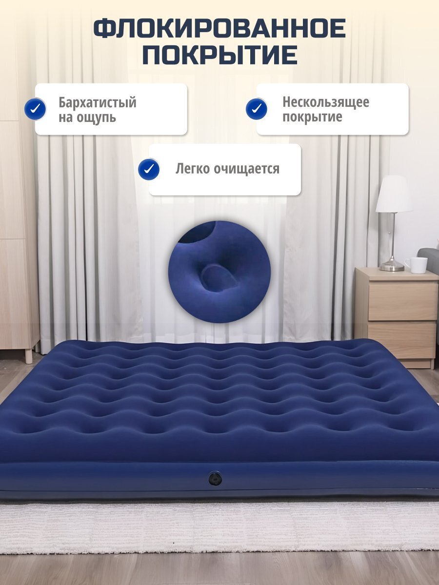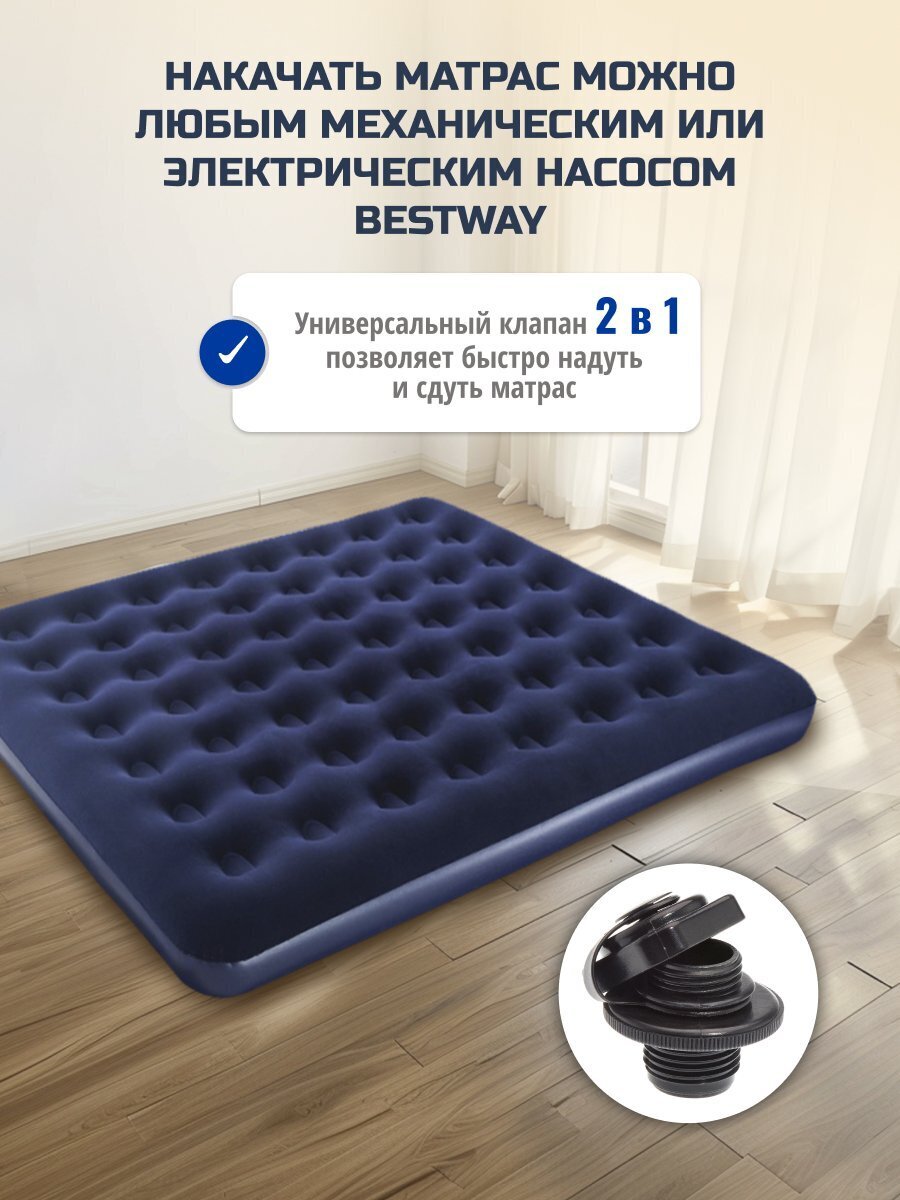 Матрас Bestway, выполненный из прочного флокированного винила, обеспечивает комфортный и здоровый сон в любых условиях. Его уникальная конструкция позволяет ему сохранять форму даже при неравномерном распределении нагрузки. Этот матрас легко надувать и сдувать, что делает его прекрасным выбором для путешествий или отдыха на природе. Кроме того, он может служить дополнительным спальным местом в квартире или доме. Если пространство ограничено, надувные матрасы становятся отличным решением для размещения гостей. Всё, что нужно сделать, - это надуть матрас и разместить его в свободной комнате.