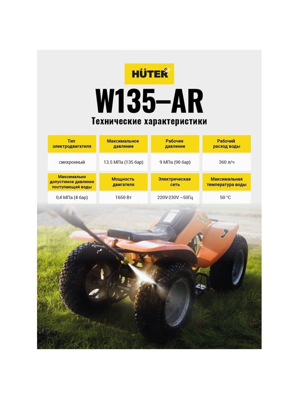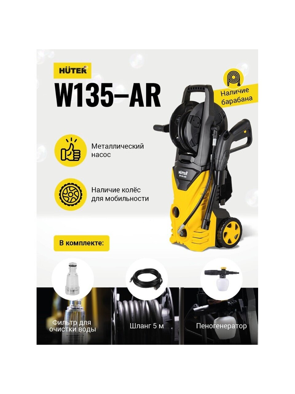 Мойка высокого давления Huter W135-AR разработана и создана немецкими специалистами компании Huter специально для повышения эффективности работ, связанных с удалением различных загрязнений. С помощью этого аппарата можно быстро и качественно произвести очистку фасадов строений, бассейнов, каменных дорожек и площадок, а так же легко и быстро помыть автомобиль, велосипед, окна, садовые инструменты и т.д. Главный рабочий инструмент такой минимойки – это струя воды под серьезным давлением. Может использоваться, так же, специальная насадка с емкостью для моющего средства. Источником воды может быть как водопровод, так и любая емкость с необходимым объемом достаточно чистой воды (бочка, канистра и т.д., или природный водоем со стоячей водой). Агрегат успешно может использоваться и в городе, и в условиях загородного дома.