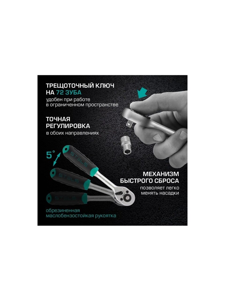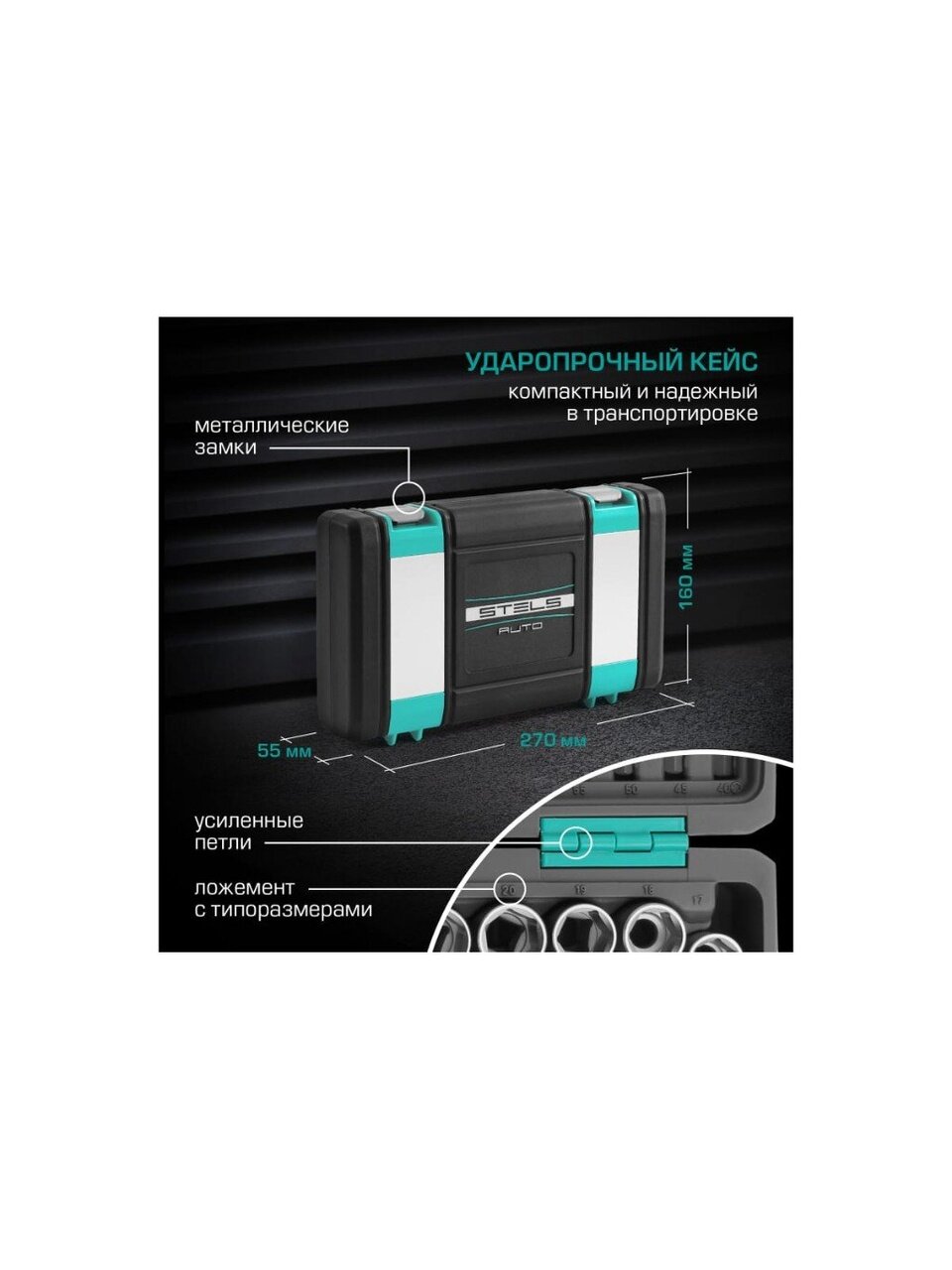 Наборы инструментов торговой марки STELS разработаны специально для автолюбителей и центров технического обслуживания. Каждый этап производства контролируется в соответствии с международными стандартами. Головки и комбинированные ключи изготовлены из хромованадиевой стали, придающей инструменту исключительную твердость в сочетании с легкостью. Биты, биты-вставки и отвёртки производятся из стали S2, улучшающей свойства инструмента. Все наборы упакованы в кейс, изготовленный из жесткого противоударного пластика, с металлическими застёжками. Наборы инструмента STELS пригодятся вам не только в автомобиле. С их помощью можно проводить бытовой ремонт дома и на даче, ремонт бытовых конструкций и садовой техники.