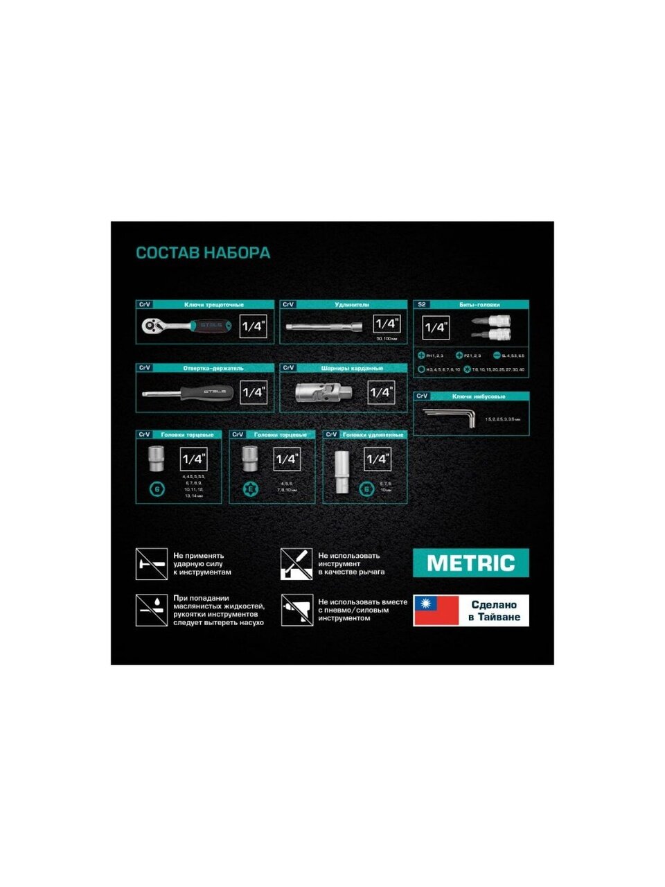 - головки торцевые 1/4" со вставкой: Т8, Т10, Т15, Т20, Т25, Т27, Т30, Т40, E4, E5, E6, E7, E8, E10, PH1, PH2, PH3, PZ1, PZ2, PZ3, H3, H4, H5, H6, H7, H8, H10, SL4, SL5,5, SL6,5.