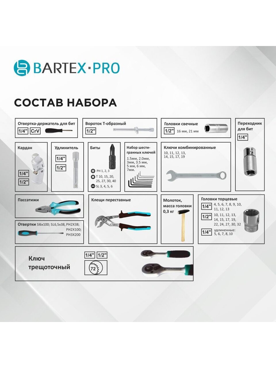 - Головки торцевые 1/2": 10, 11, 12, 13, 14, 15, 17, 19, 22, 24, 27, 30, 32.