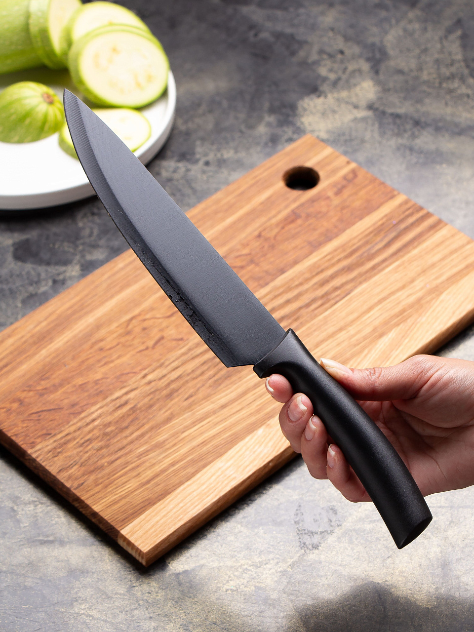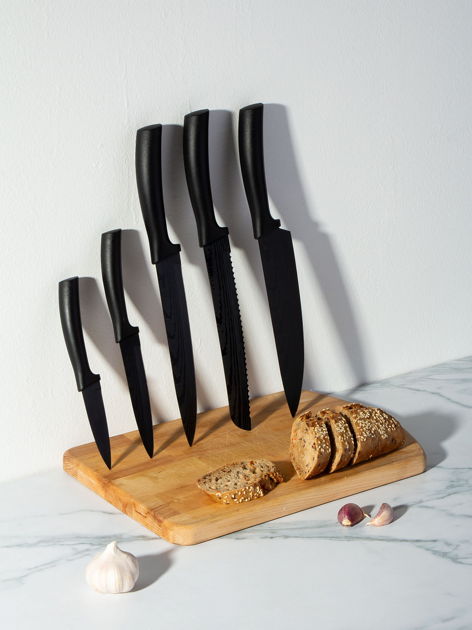 - оптимальный набор из 5 ножей для разных видов продуктов;