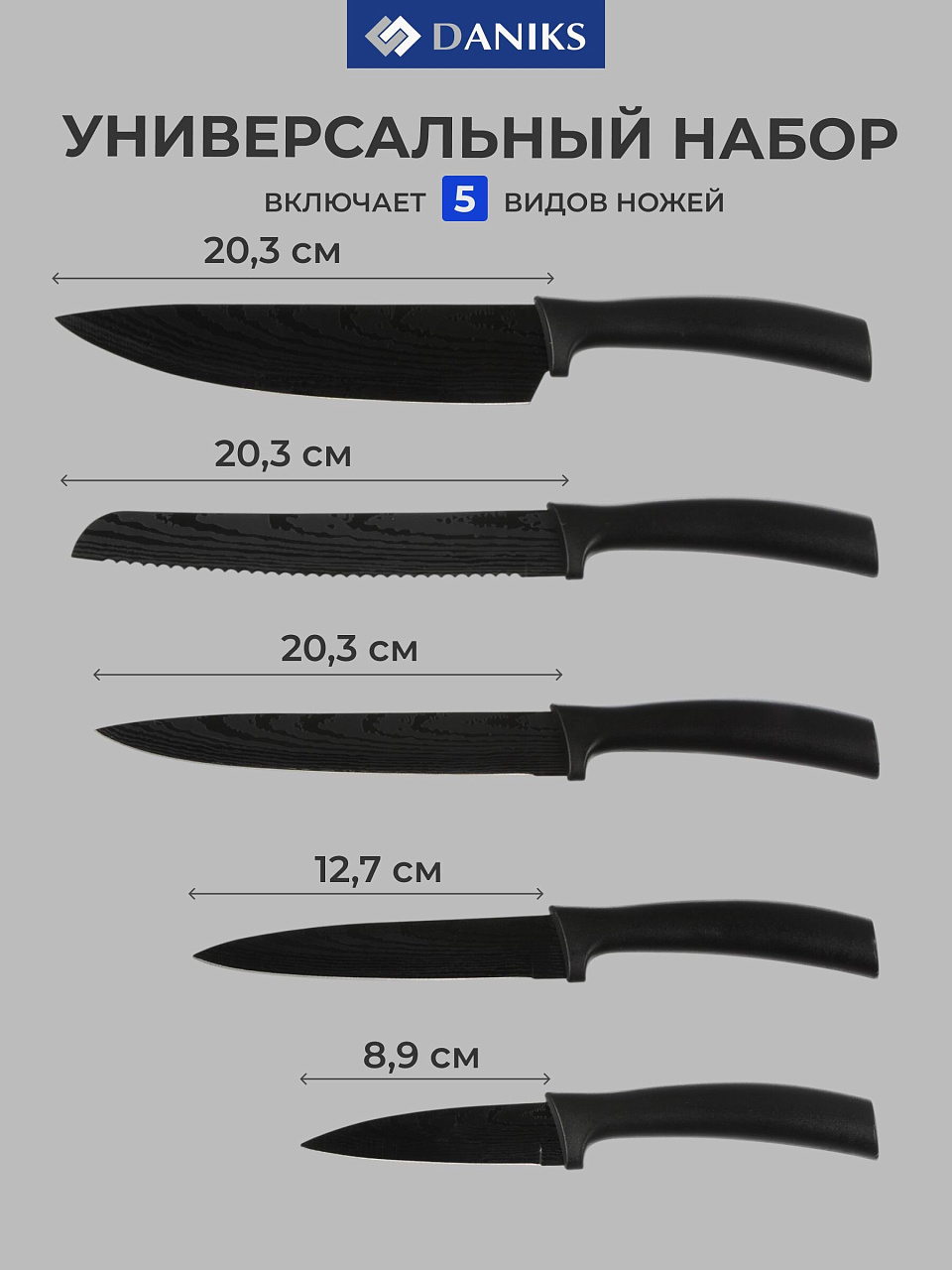 Набор ножей 5 предметов Daniks Gusta Y4-8916 – идеальное решение для современной кухни, сочетающее в себе высокое качество, стильный дизайн и практичность. Эффективная помощь в ежедневной готовке, когда нужно быстро и аккуратно нарезать продукты, не теряя времени на поиски подходящего инструмента. Универсальный комплект, включающий шеф-нож, нож для овощей, универсальный нож, хлебный нож и разделочный нож, подойдёт для любых кулинарных задач. Эргономичная рукоятка из прочного пластика обеспечивает комфорт и безопасность в использовании, а лезвия из нержавеющей стали гарантируют долговечность и остроту на долгое время. Компактная упаковка на блистере делает хранение и транспортировку максимально удобными.