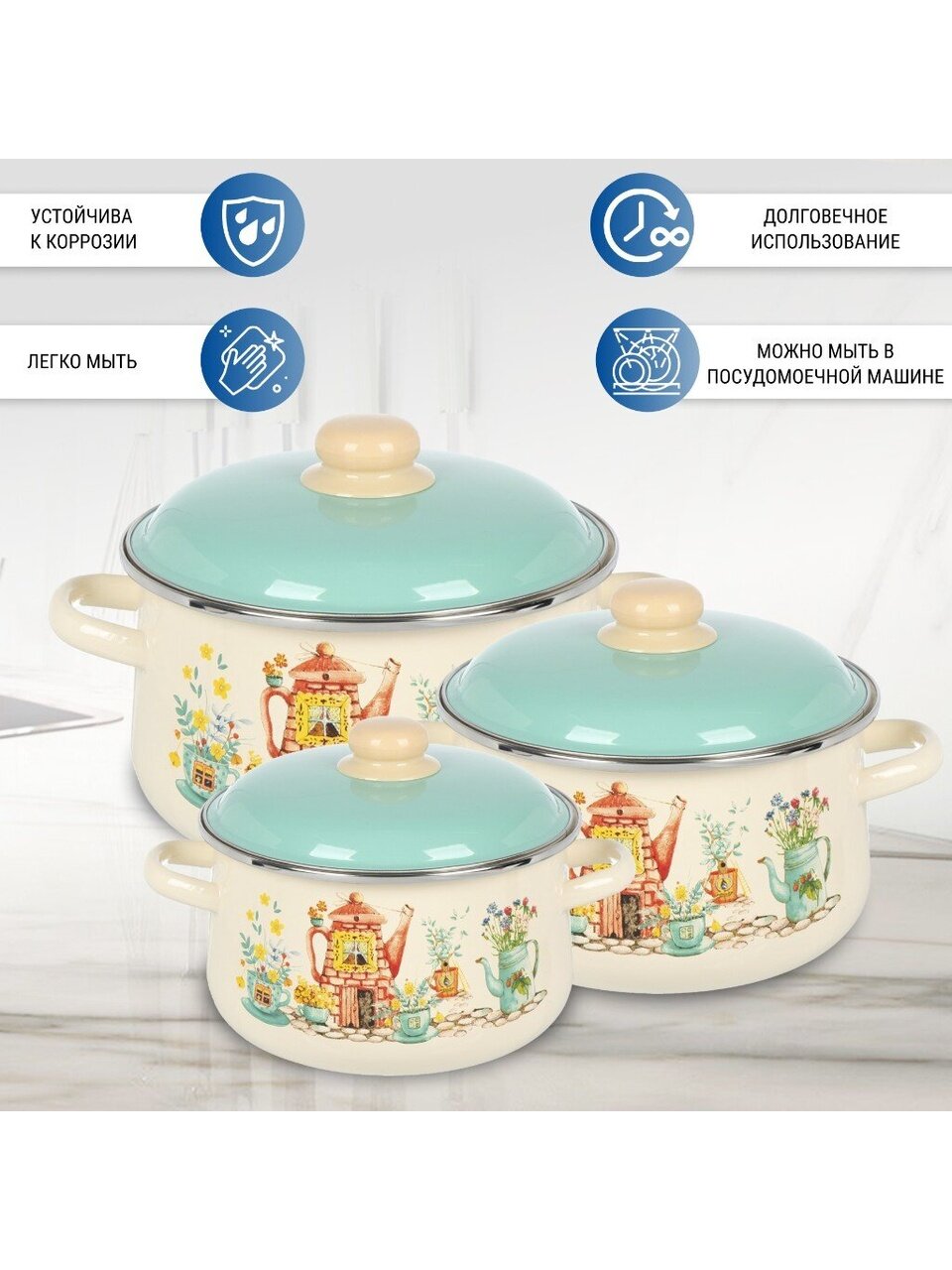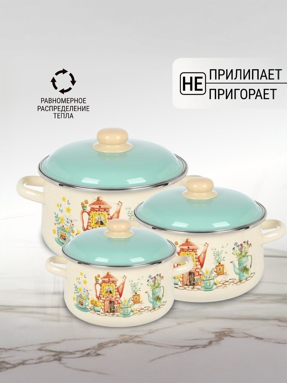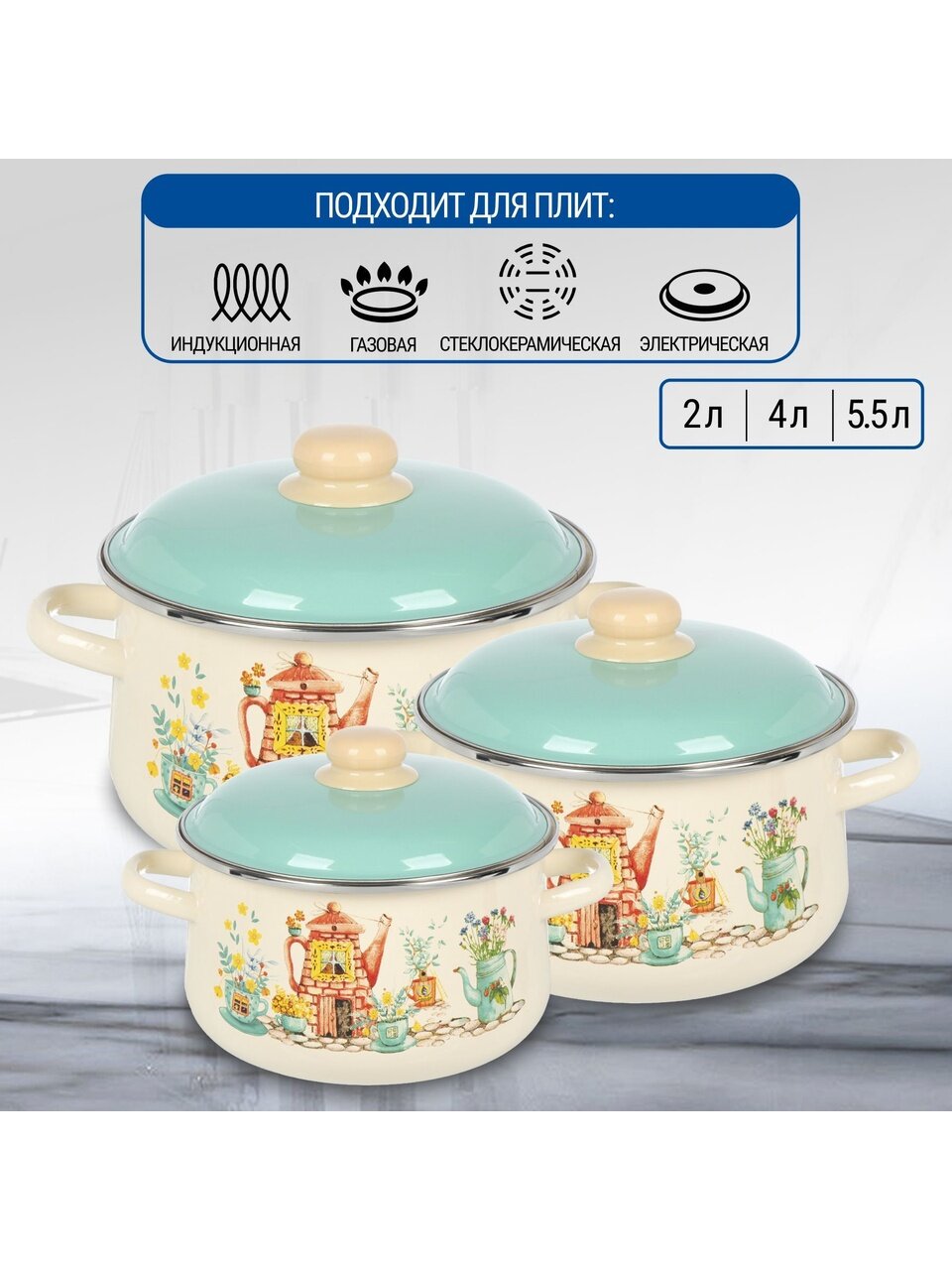 Эмалированный набор кастрюль 3-в-1 «Чайный домик» 2, 4 и 5.5 л для индукции – стильное решение для кухни и дачи, долговечность и универсальность по выгодной цене.