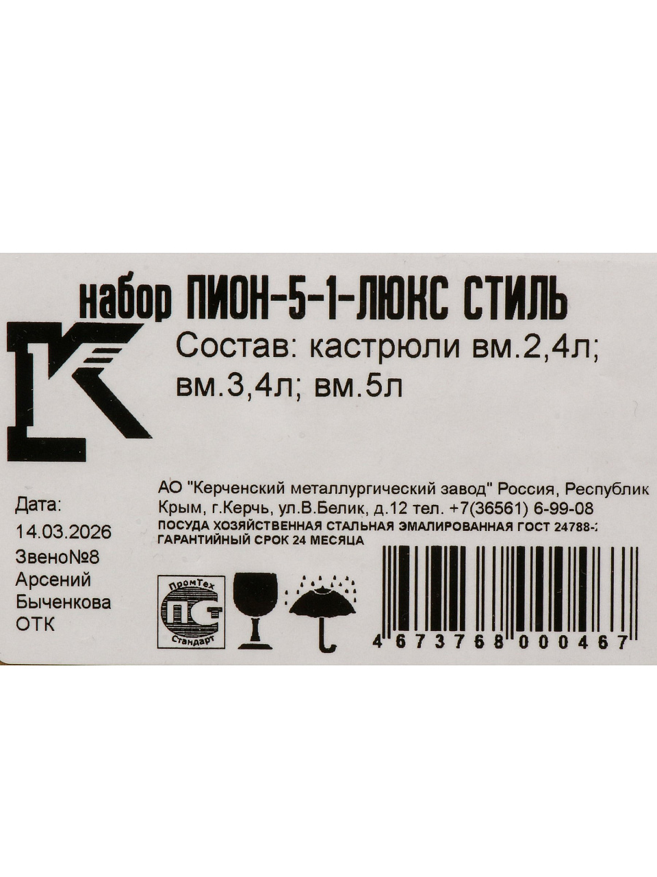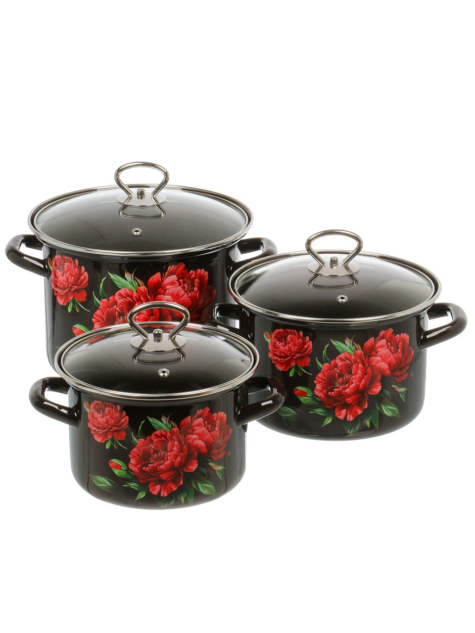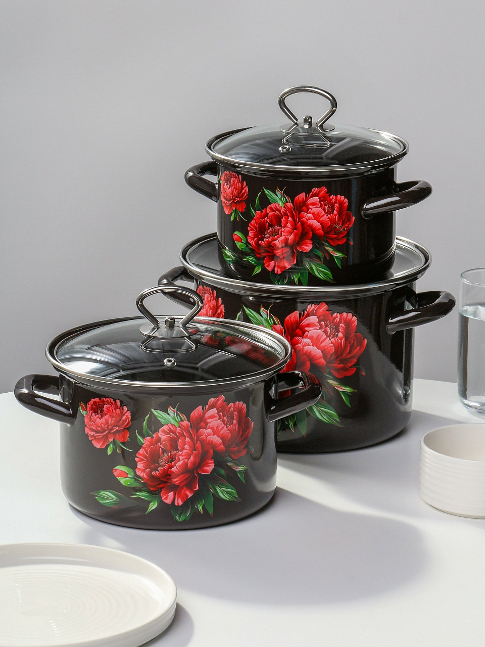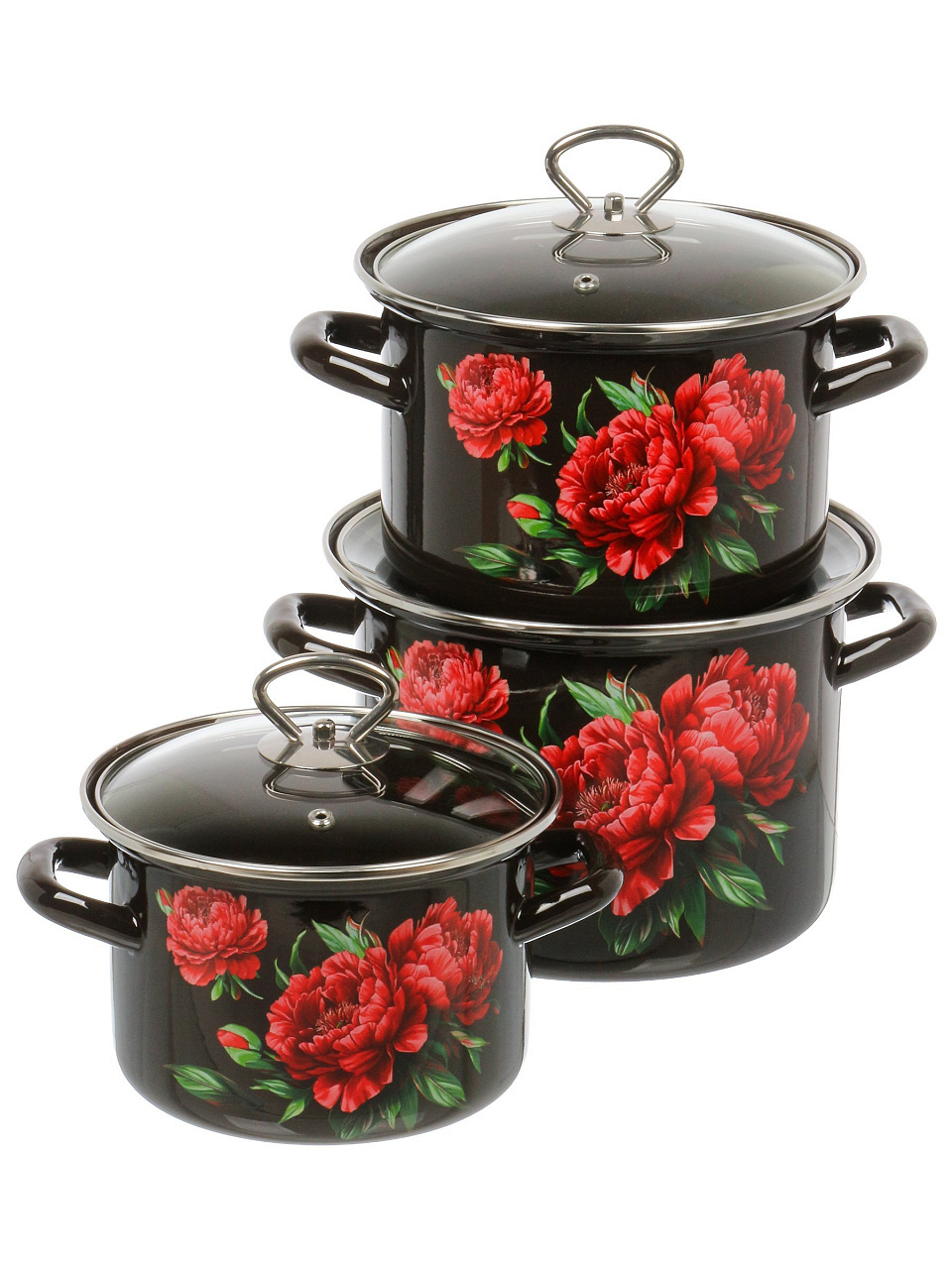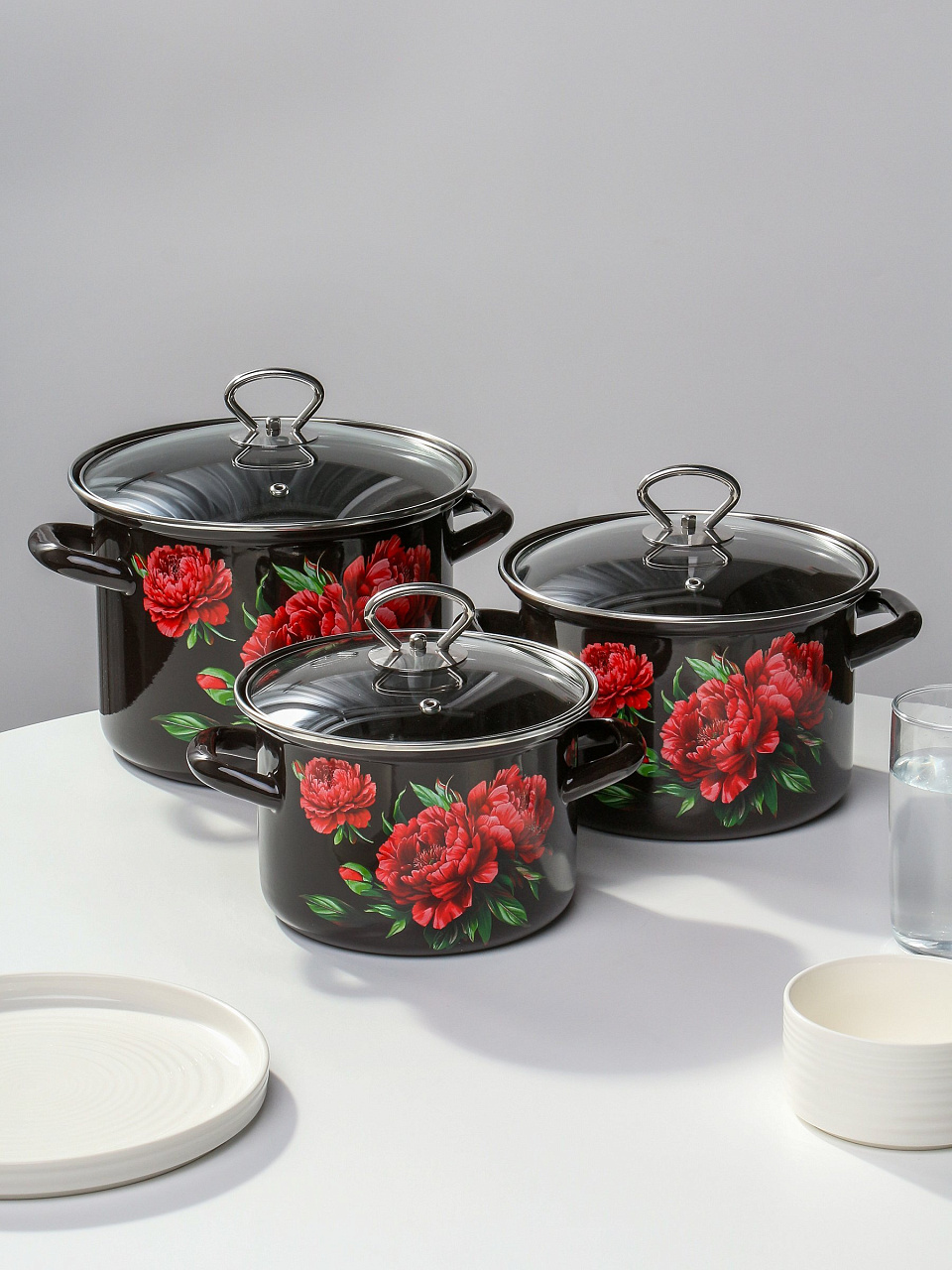 Набор посуды эмалированная сталь, 3 предмета, кастрюли 2.4, 3.4, 5 л., крыш стекло, Керченский металлургический завод, Пион-5-1-Люкс стиль