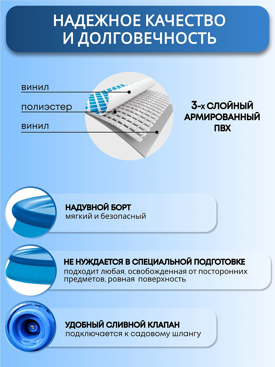 Надувной бассейн Intex — это не только комфортный отдых, но и экономия времени и сил. Его конструкция с надувным бортом гарантирует безопасность и надежность, а ремонтная заплатка в комплекте позволит быстро устранить мелкие повреждения. Этот бассейн станет центральным элементом вашего летнего досуга, даря радость и прохладу всей семье.