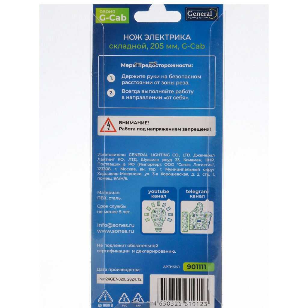 Длина ножа — 205 мм, длина трапециевидного выдвижного лезвия — 82 мм. В комплекте 1 лезвие, корпус складной, производитель — General Lighting Systems, модель G-Cab.