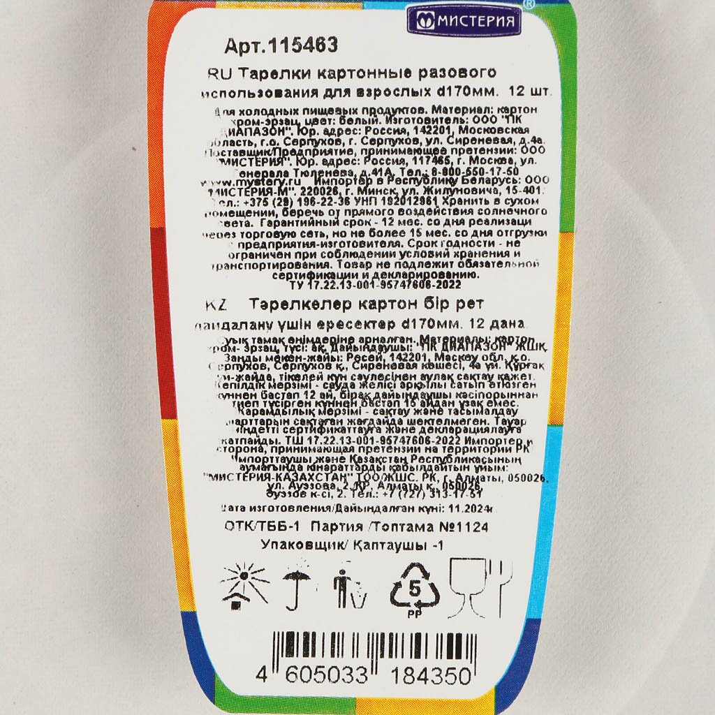 В наборе 12 белых тарелок диаметром 170 мм, выполненных из прочного картона. Производитель — Мистерия, страна продавца — Россия, артикул 183000.