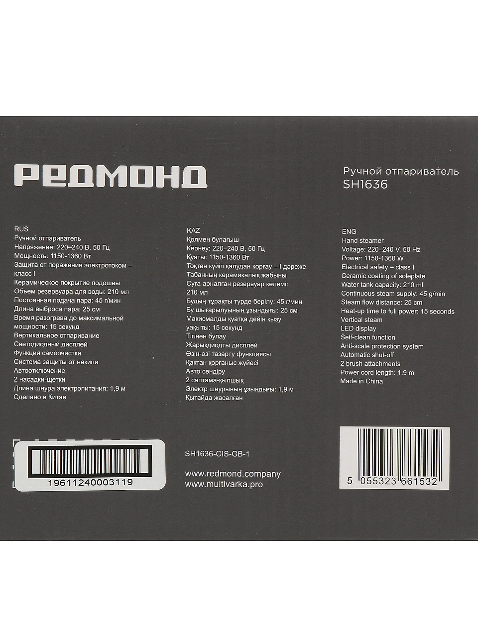 Отпариватель Редмонд SH1636 — быстрое и бережное разглаживание одежды дома и в поездках: мощность 1360 Вт, легкий корпус, стильный дизайн, экономия времени.