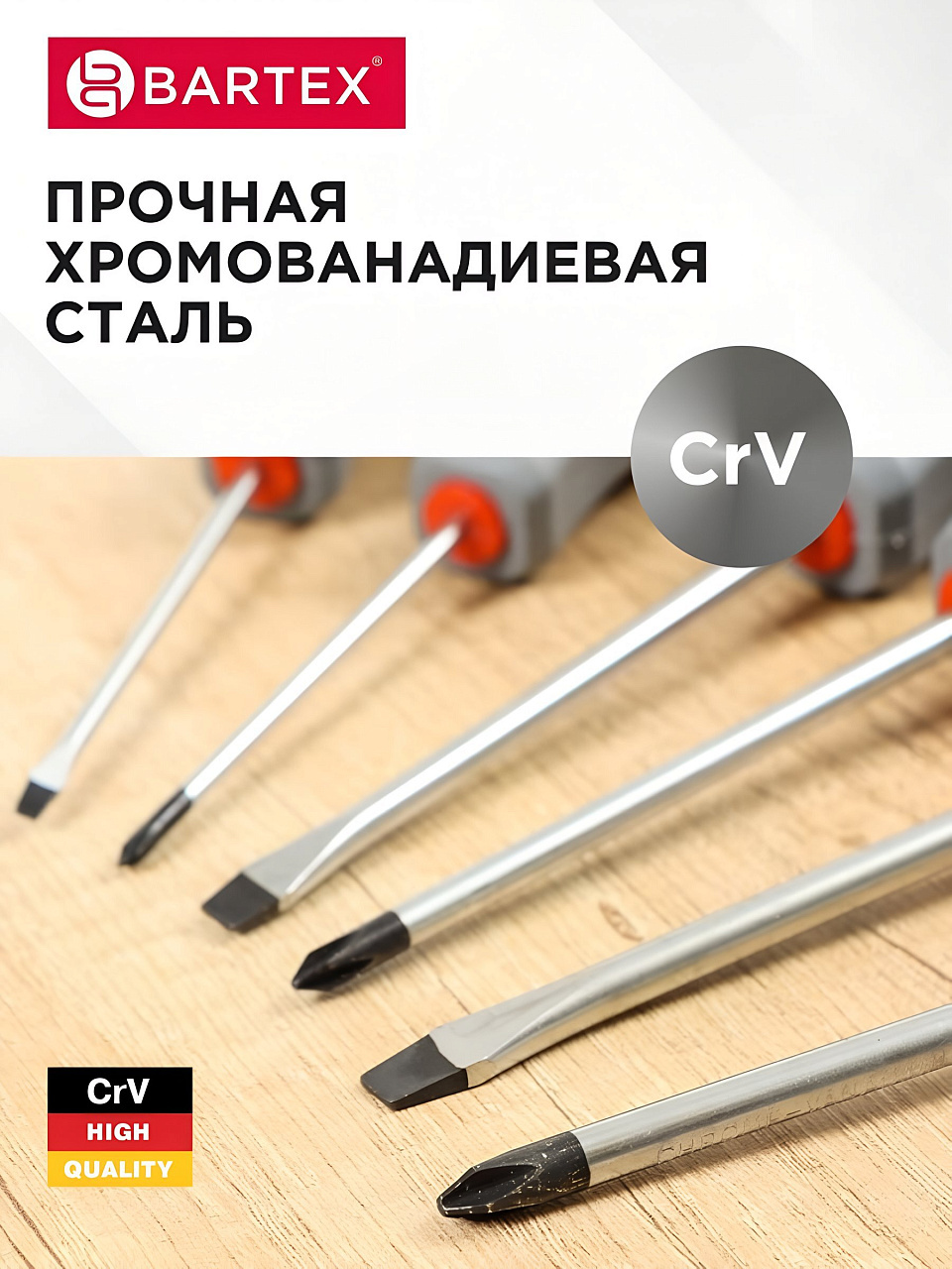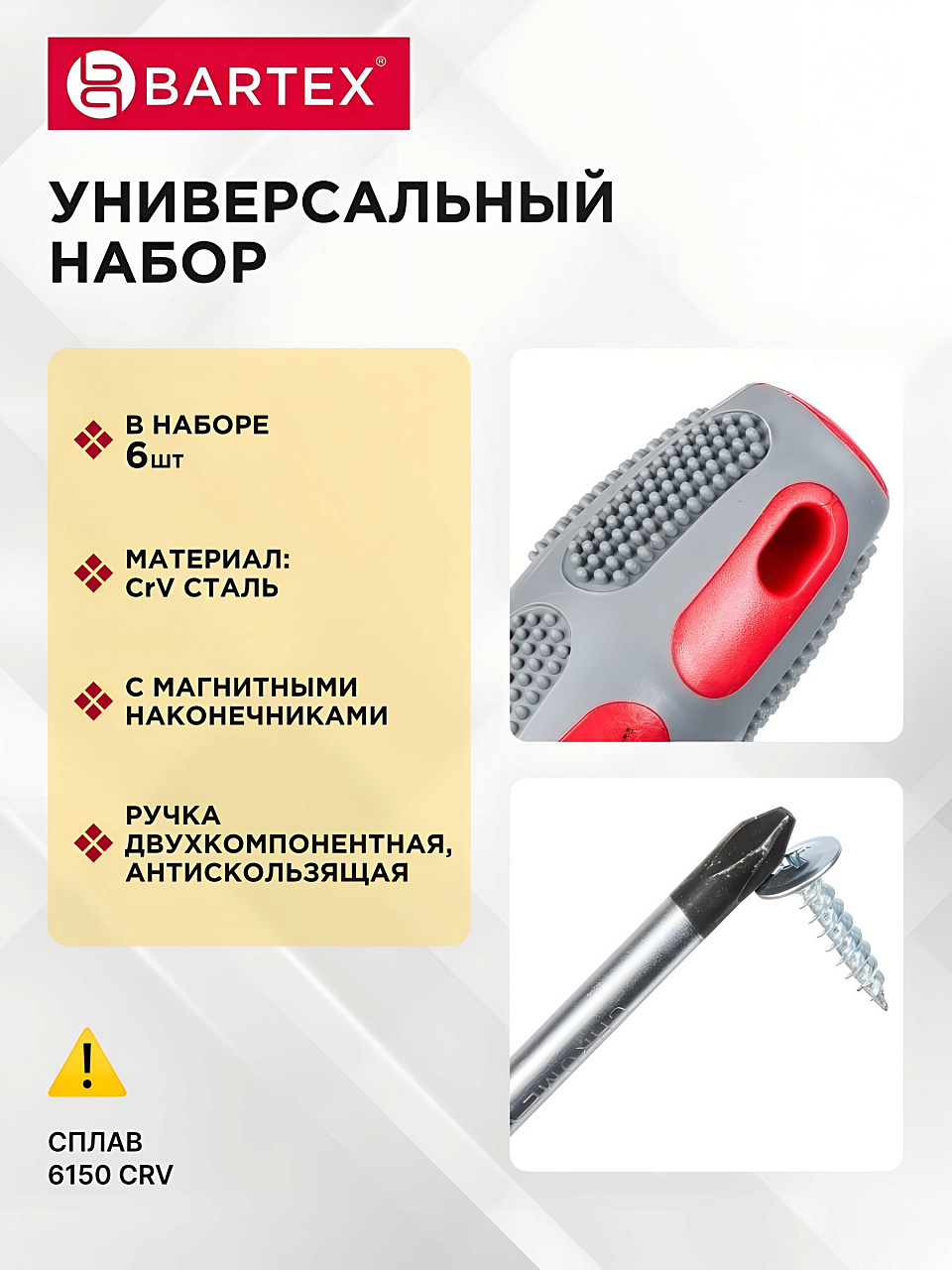 Набор отверток 6 предметов Bartex SCDFS-6 – надежный инструмент для точных и быстрых работ по дому и на даче. Удобные двухкомпонентные ручки с антискользящим покрытием обеспечивают комфорт и безопасность в использовании. Прочные стержни из CrV стали и магнитные наконечники позволяют легко работать с крепежом разного типа. Универсальный комплект для любых задач!