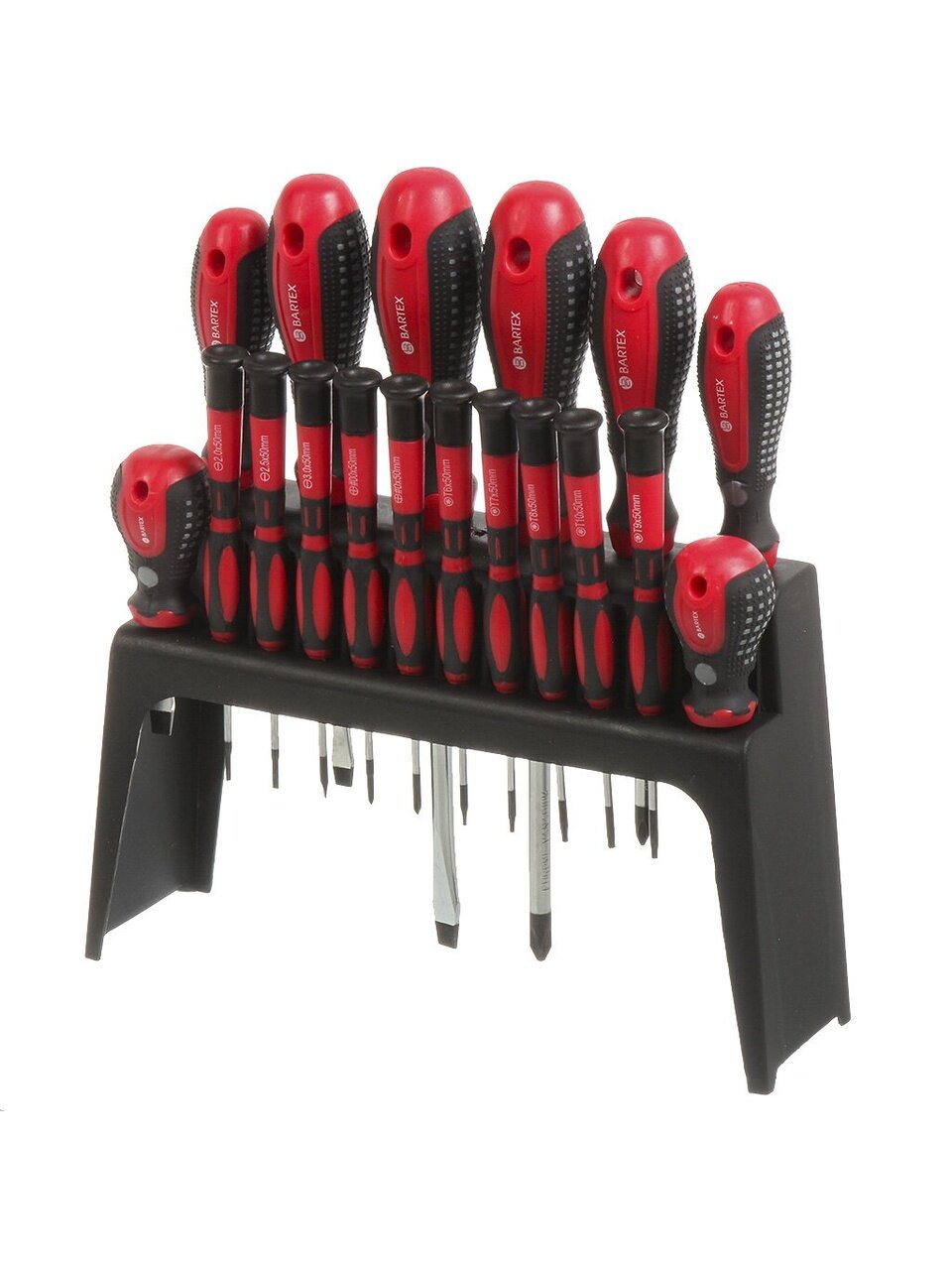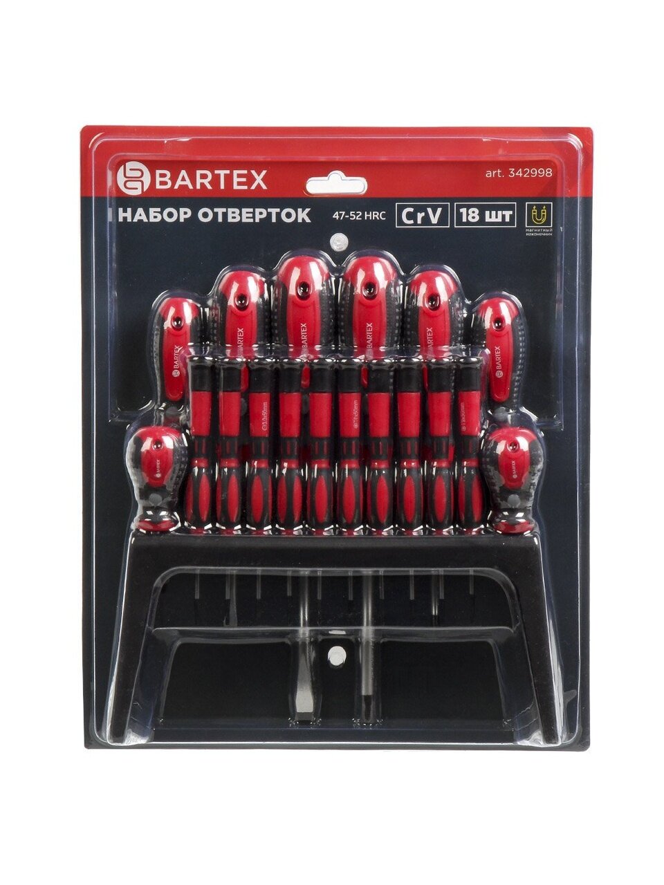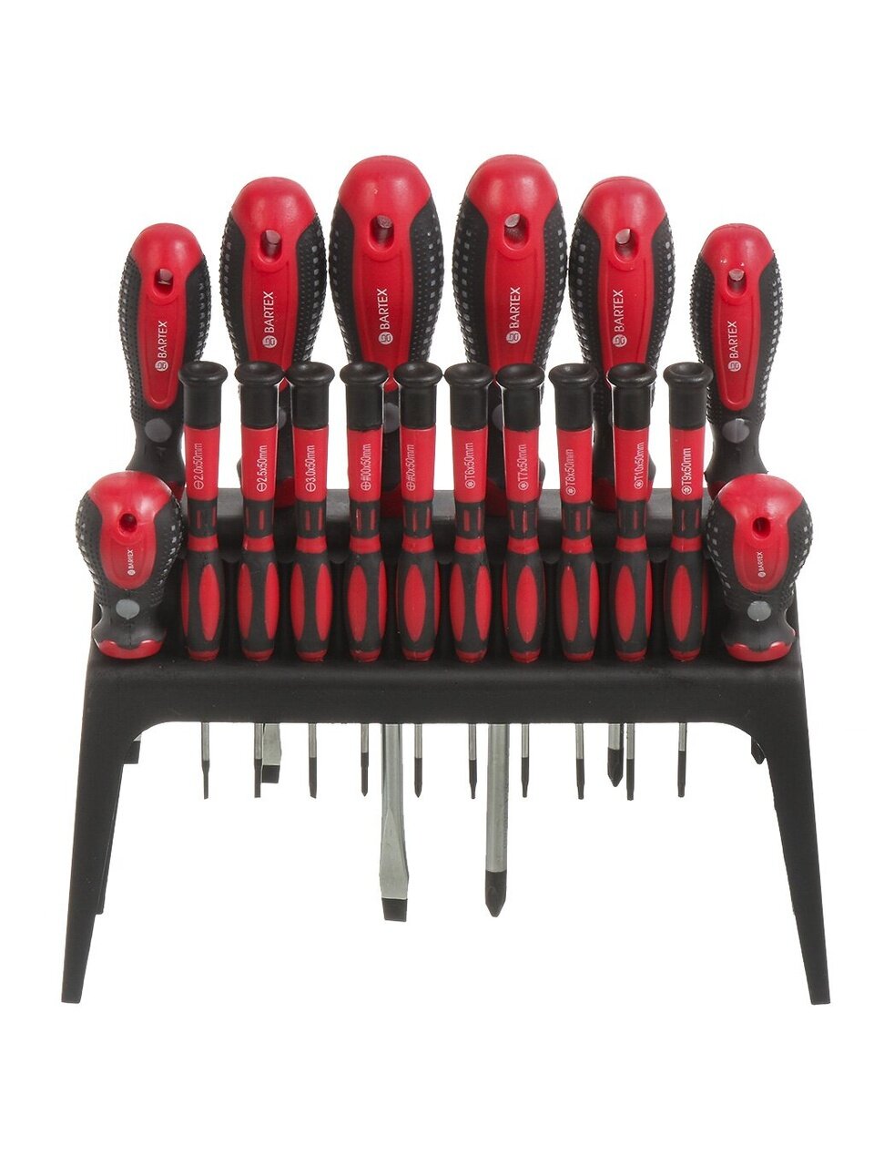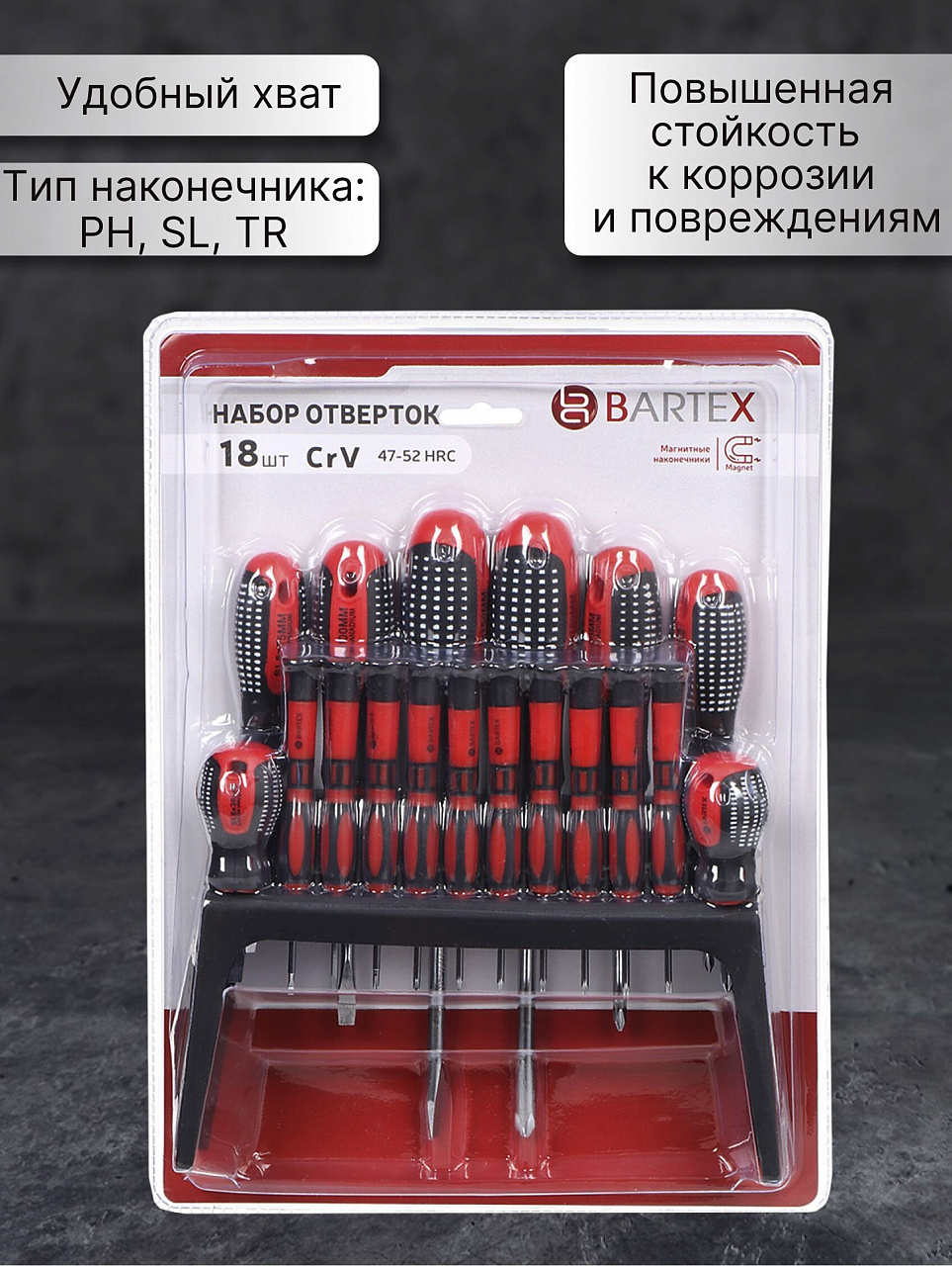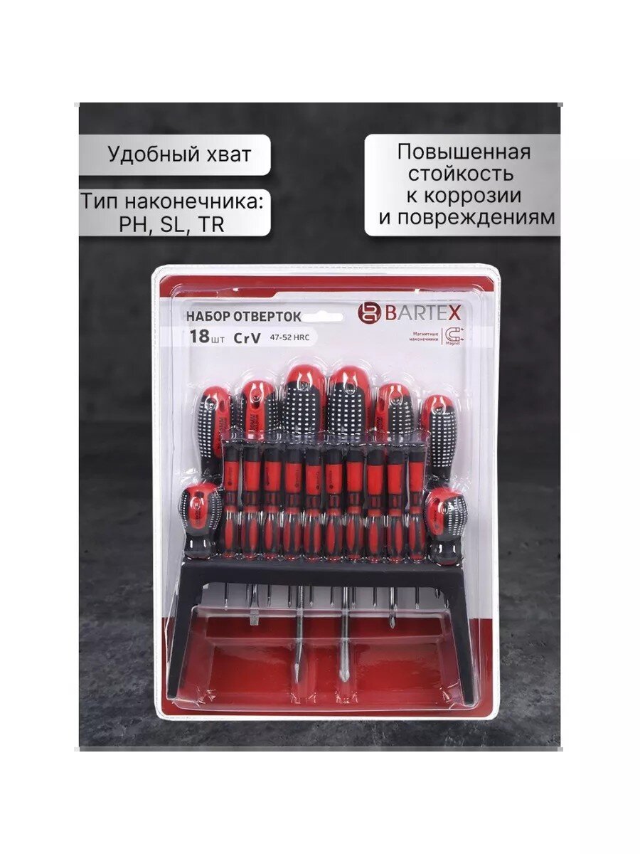 Набор отверток 18 предметов Bartex – надежный и функциональный инструмент для дома, дачи, мастерской и гаража. Универсальный комплект для выполнения широкого спектра монтажных и ремонтных работ, который станет незаменимым помощником в любом хозяйстве. Современный дизайн, яркий красный цвет и продуманная эргономика делают использование набора удобным и приятным. Каждый инструмент изготовлен из высококачественной стали CrV, что гарантирует прочность, долговечность и стойкость к износу при интенсивной эксплуатации.
