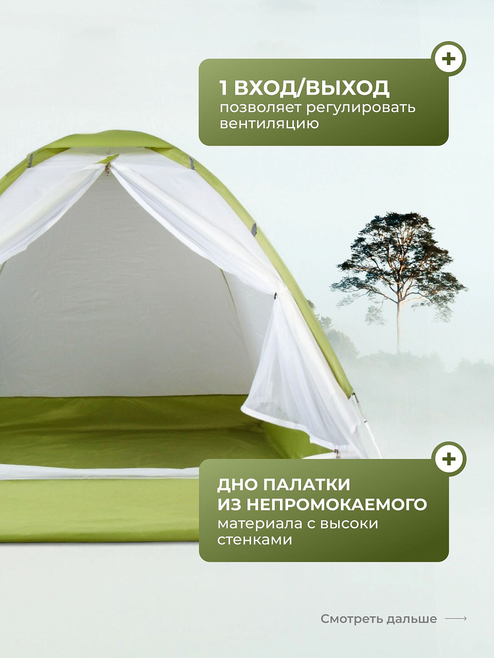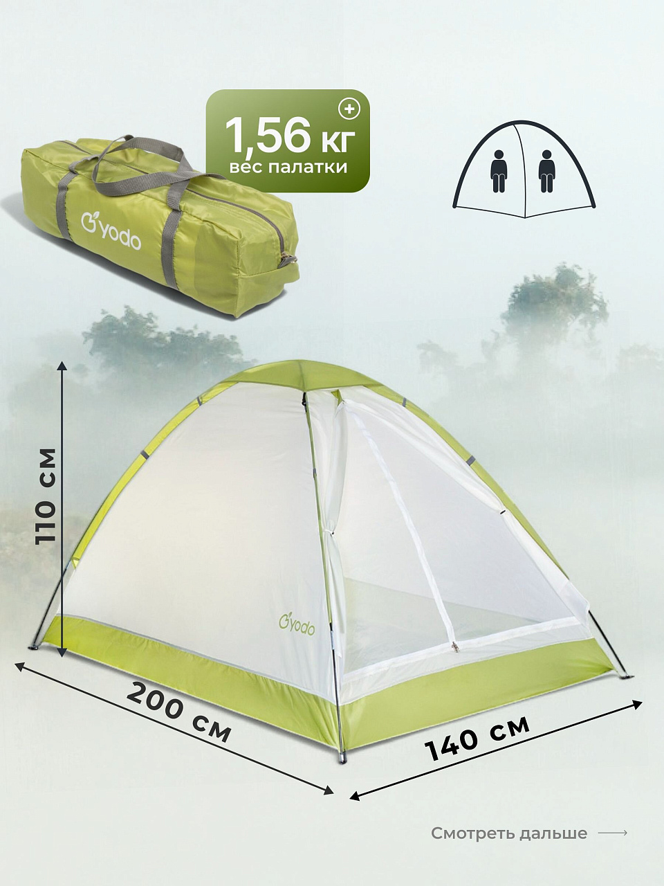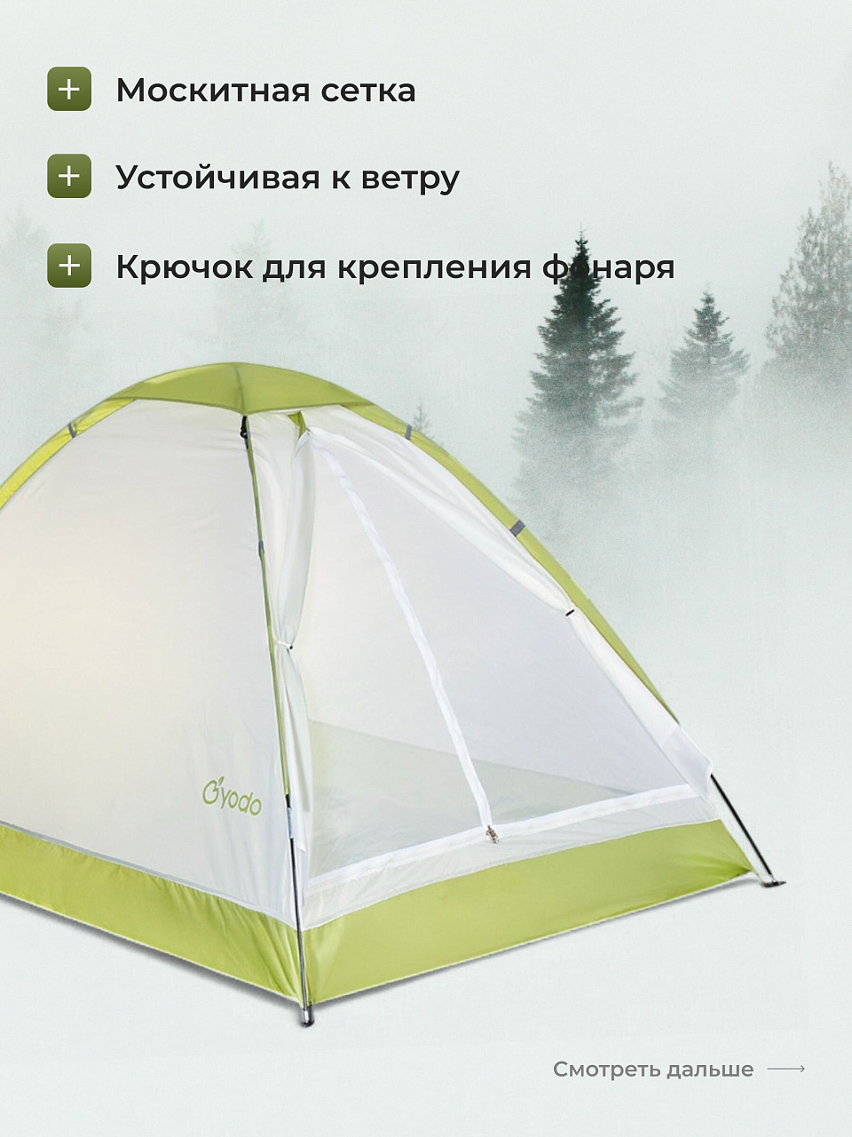 Палатка выполнена из прочного полиэстера, что гарантирует долговечность и устойчивость к внешним воздействиям. Каркас из фибергласса диаметром 6.9 мм обеспечивает стабильность и надежность конструкции, а противомоскитная сетка защитит от надоедливых насекомых, позволяя наслаждаться свежим воздухом и природой. Вес палатки всего 1.6 кг, что делает ее идеальной для пеших прогулок и путешествий.