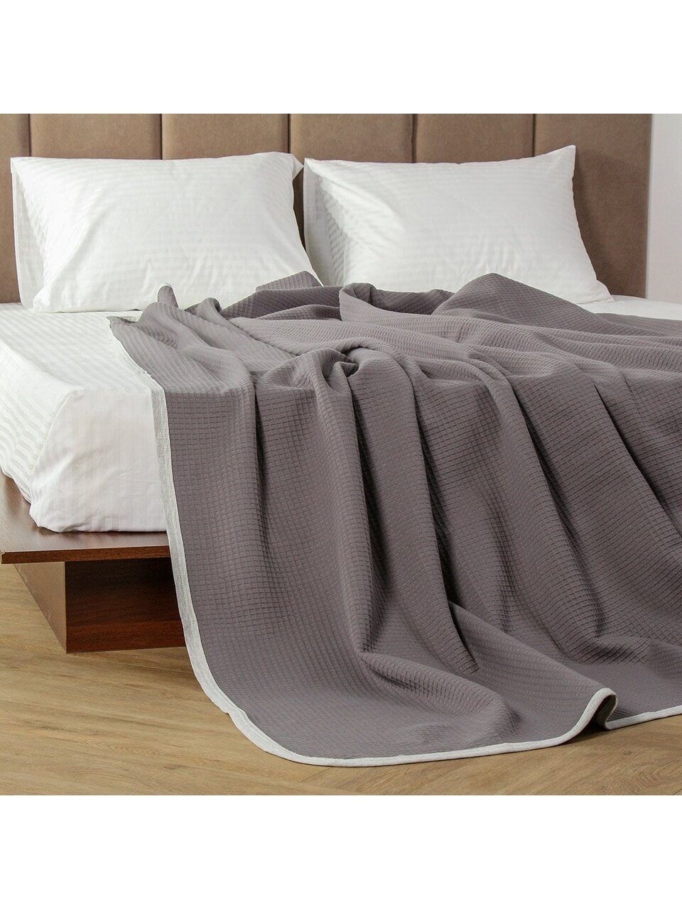 Плед из 100% хлопка — гипоаллергенный, дышащий, не электризуется и приятен к телу. Его легко стирать, он не теряет форму и цвет, что выгодно для регулярного домашнего использования.
