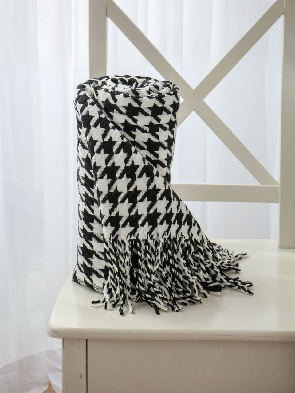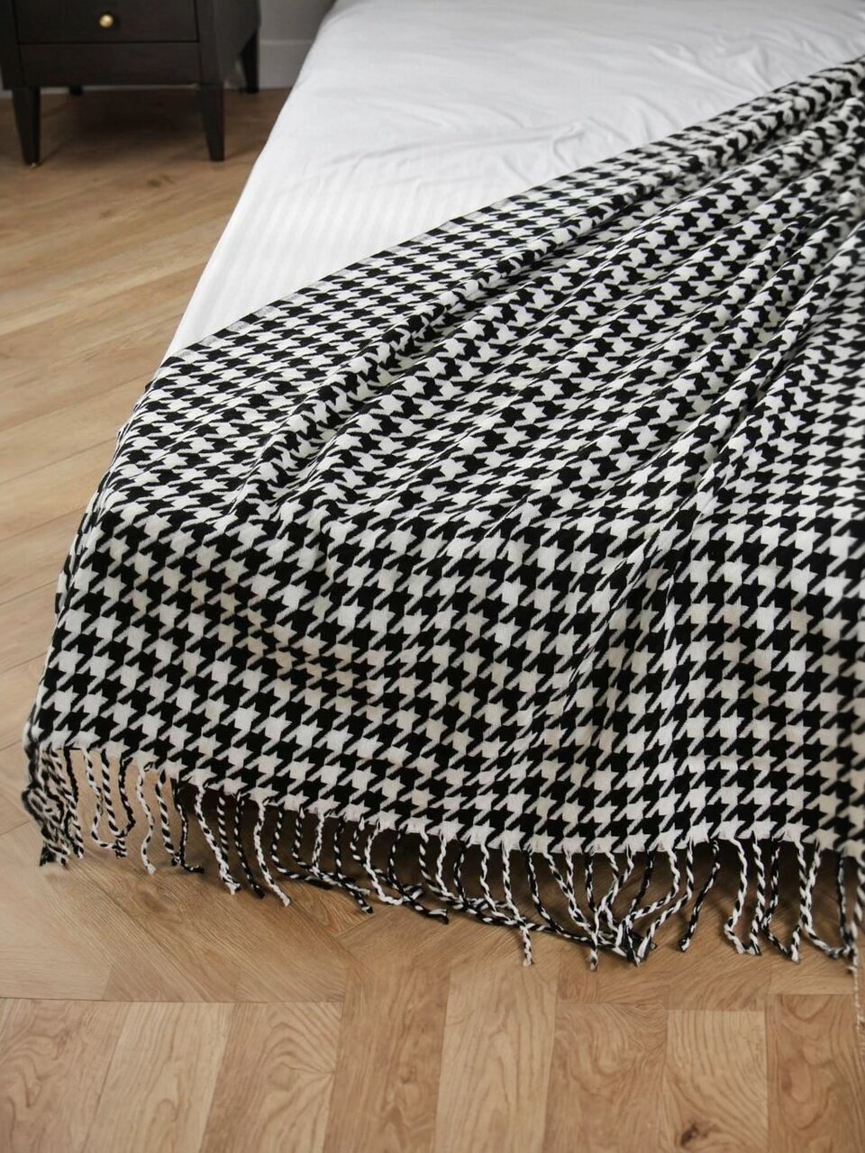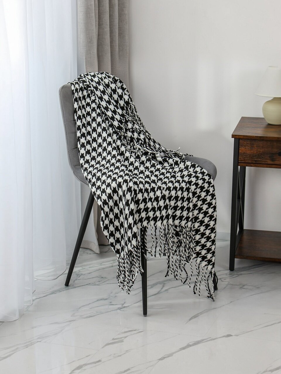 - Уникальный дизайн: модный вязаный плед с рисунком "гусиная лапка" — эффектный акцент в интерьере.