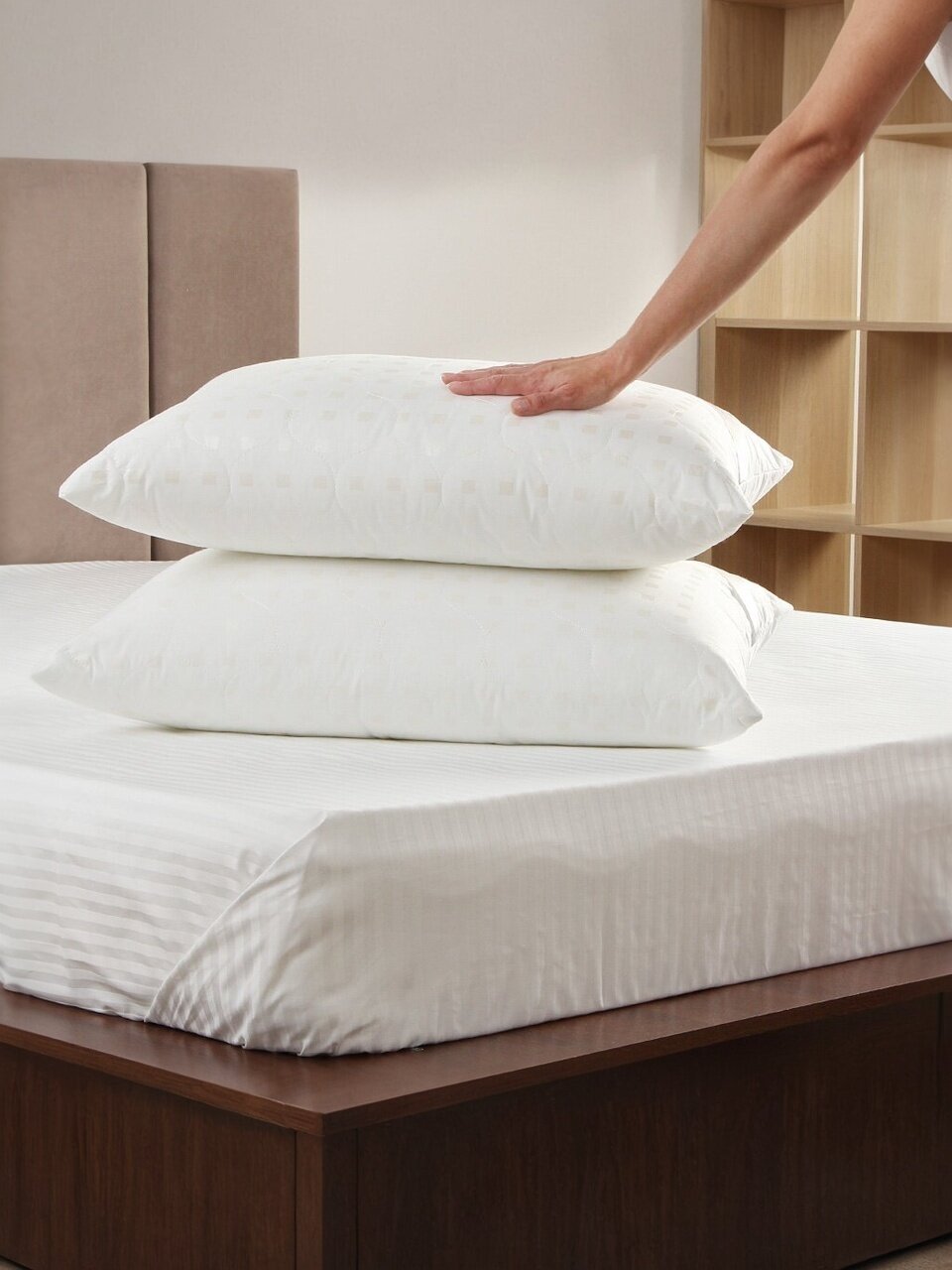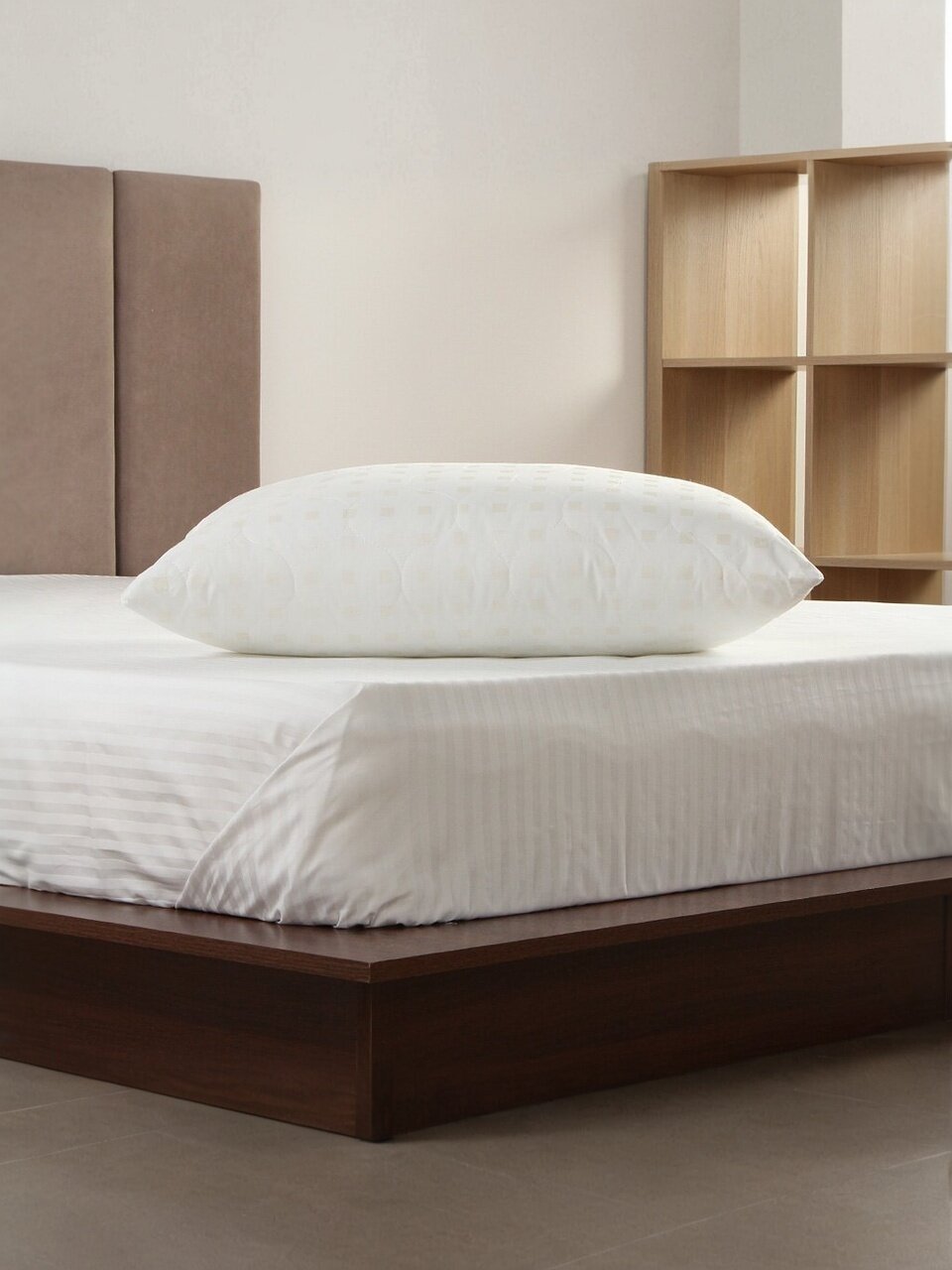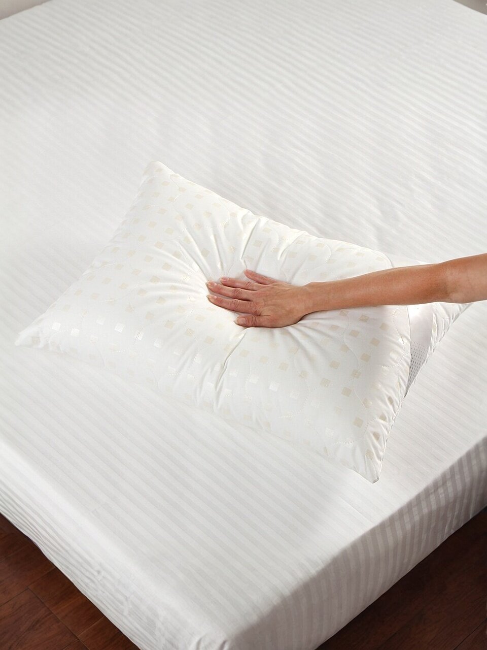 Размер подушки — 50 х 70 см, уровень жесткости и высота — средние. Форма прямоугольная, стиль современный, цвет белый.