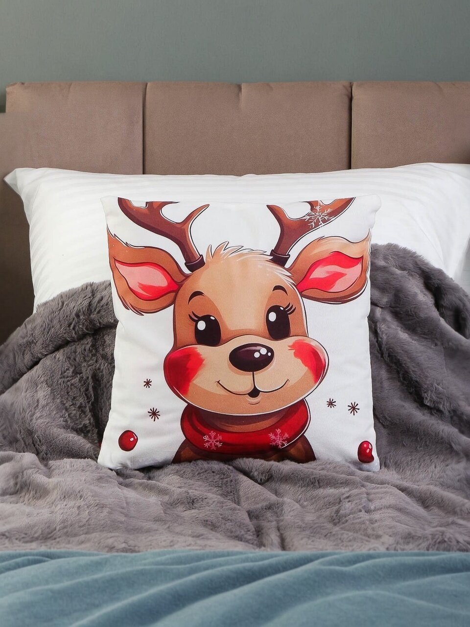 Декоративная подушка 38х38 см с рисунком оленя: уютный акцент для дома и дачи, мягкая микрофибра, стильный подарок к Новому году.