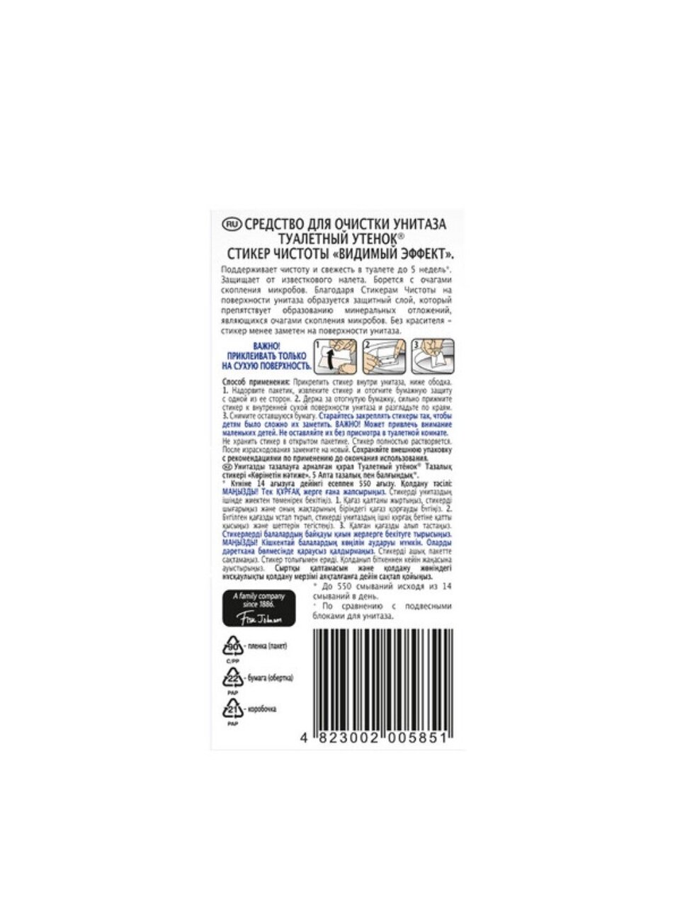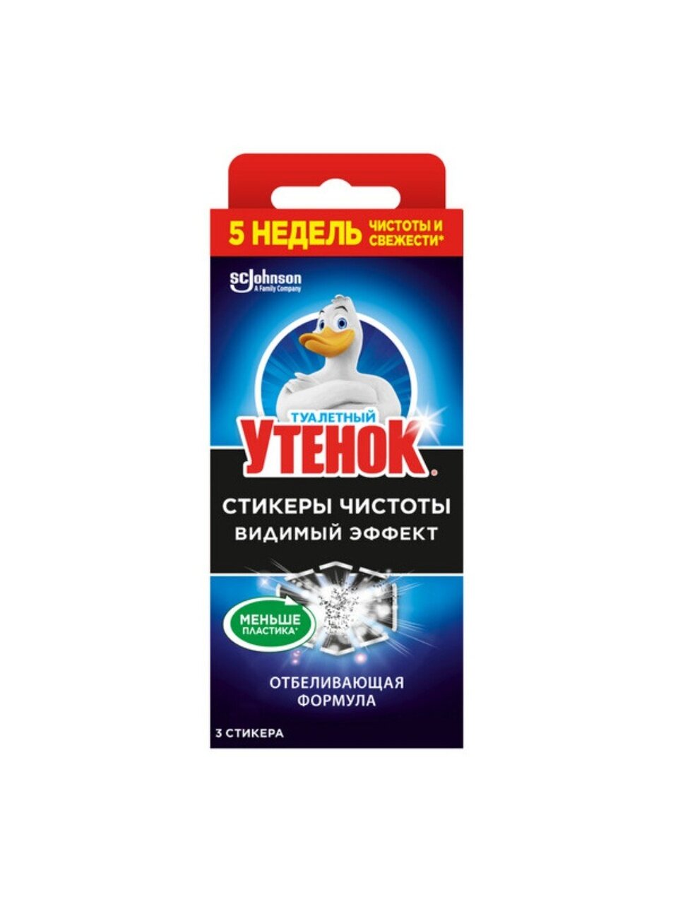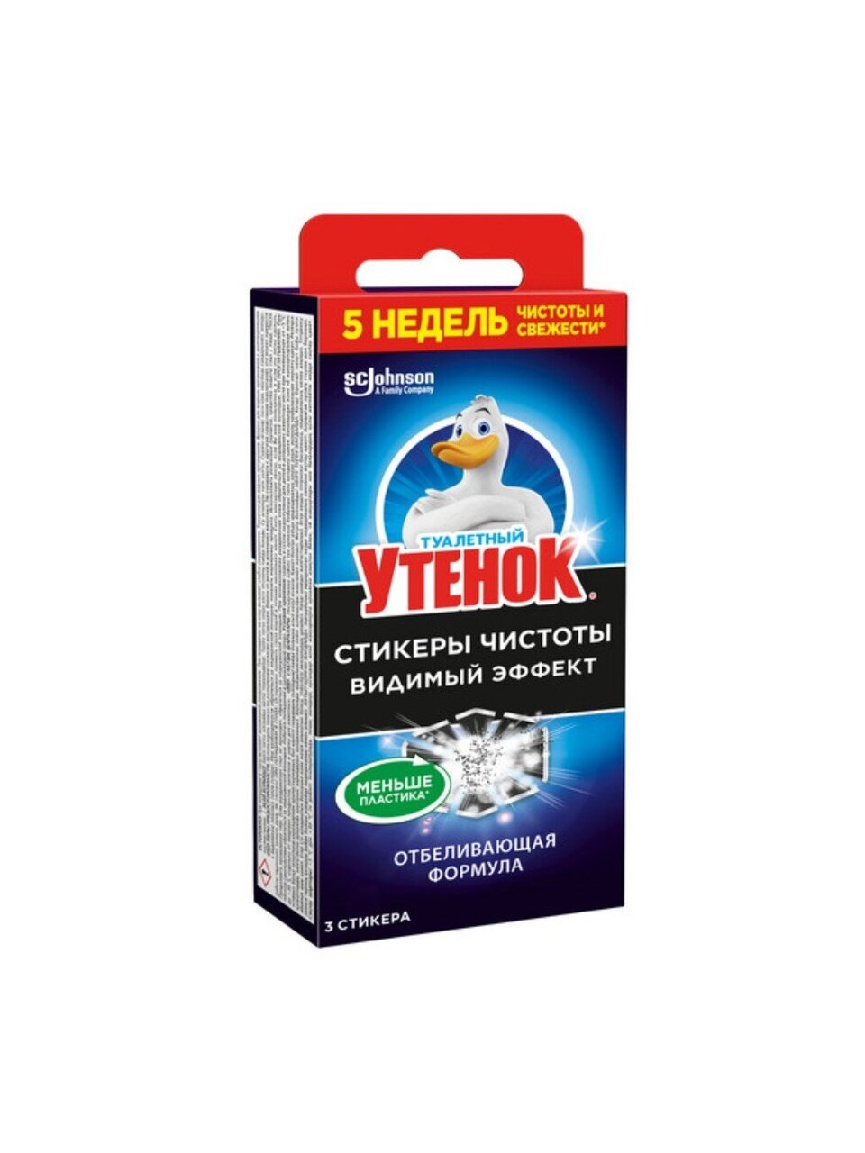 Благодаря очистителю Туалетный утенок "Стикер чистоты" на поверхности унитаза образуется защитный слой, который препятствует образованию минеральных отложений, являющихся очагами скопления микробов. Очиститель крепится внутри унитаза ниже ободка на сухую поверхность. Обладает приятным ароматом. Стикера хватает более чем на 100 смываний. Он полностью растворяется в воде.