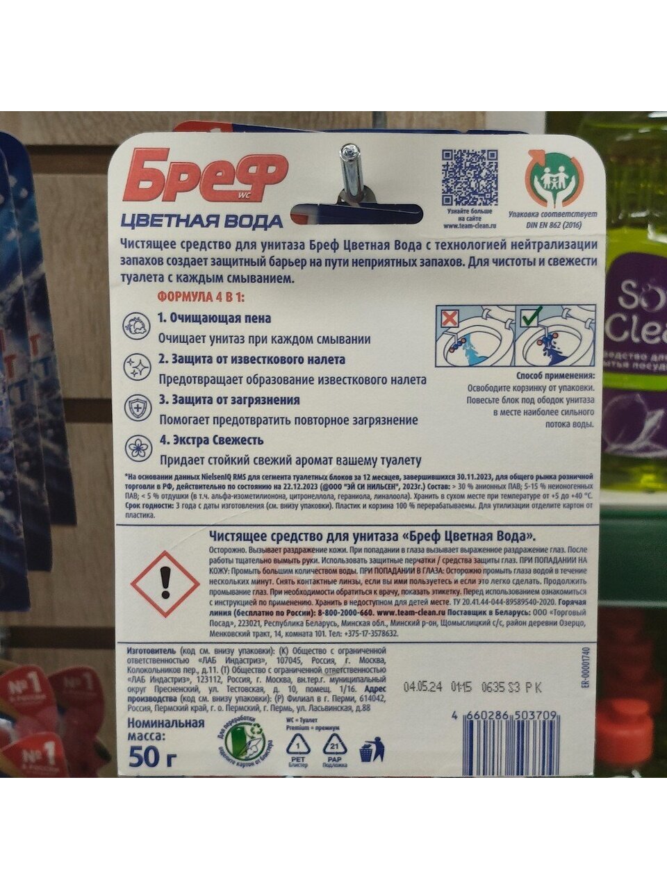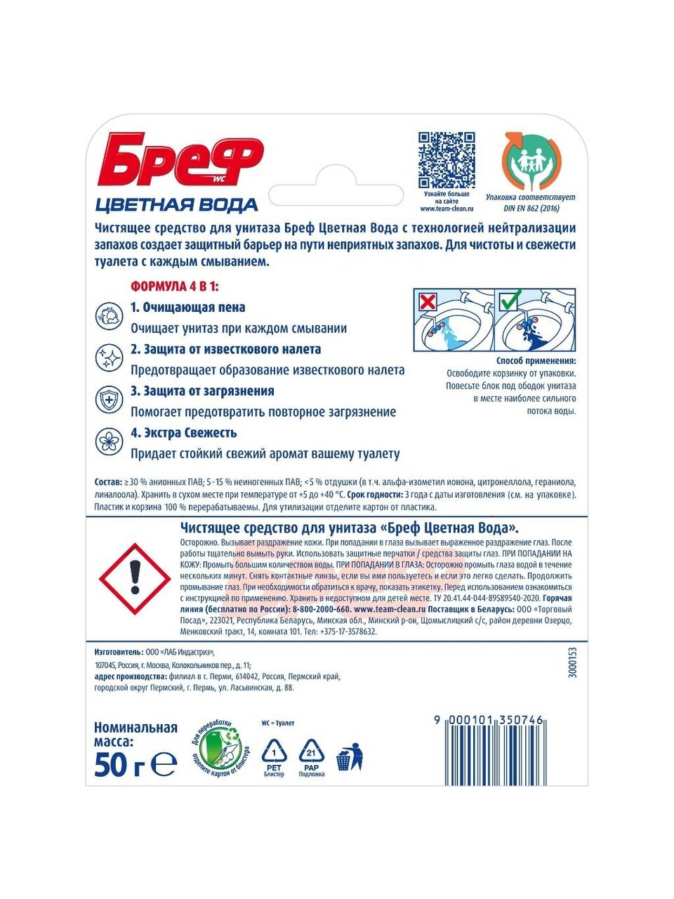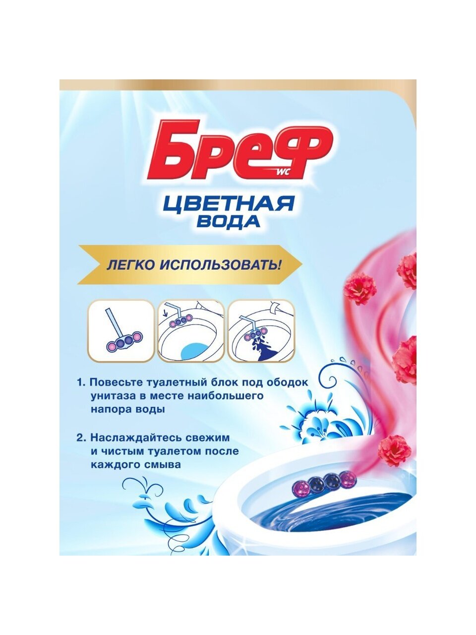 Бреф Цветная Вода — подвесной туалетный блок с технологией нейтрализации запахов, которая создает защитный барьер на пути неприятных запахов.