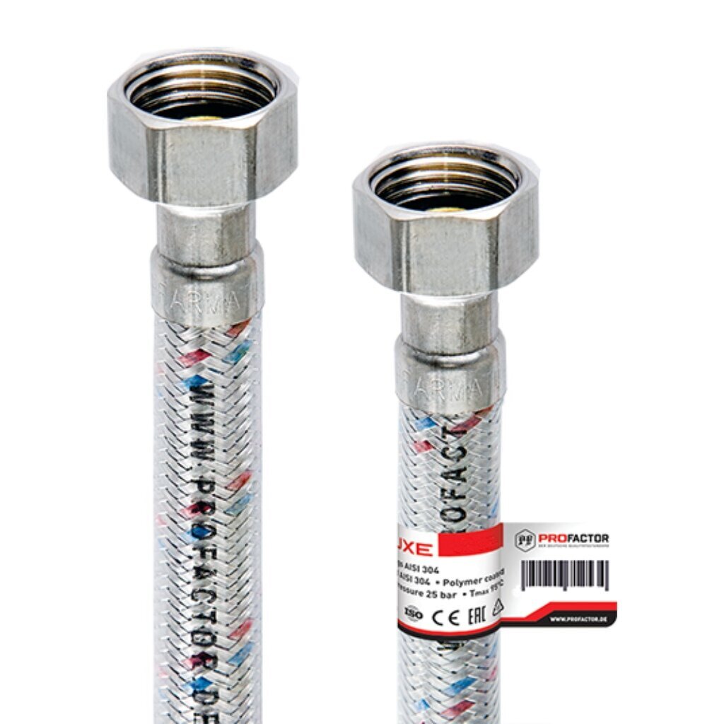 Подводка для воды 1/2"х0.8 м ProFactor — надежное решение для подключения смесителей и сантехники. Материал оплетки: нержавеющая сталь с полимерным покрытием, что обеспечивает высокую прочность и долговечность. Концевая арматура выполнена из нержавеющей стали. Подходит для горячей и холодной воды, выдерживает температуру до 95°C и давление до 25 атм. Идеальный выбор для дома и дачи.