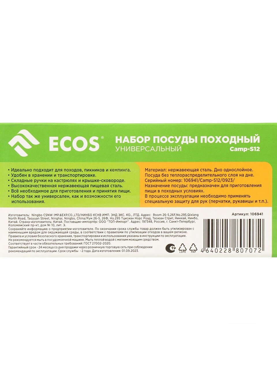 Бренд Ecos – выбор тех, кто ищет надежную посуду для похода и отдыха на природе. Модель Camp-S12 сочетает в себе практичность, долговечность и современный подход к организации быта в условиях отсутствия привычных удобств. Этот набор занимает минимум места в рюкзаке, что удобно для транспортировки и хранения.
