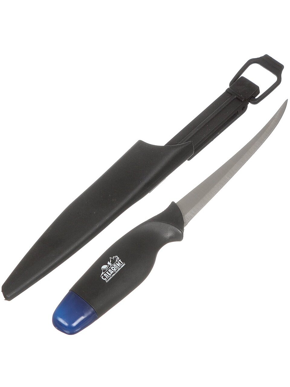 Рукоятка ножа сделана из пластика, благодаря чему инструмент имеет легкий вес и не тонет в воде. В комплекте имеется чехол для более удобного хранения и переноски.