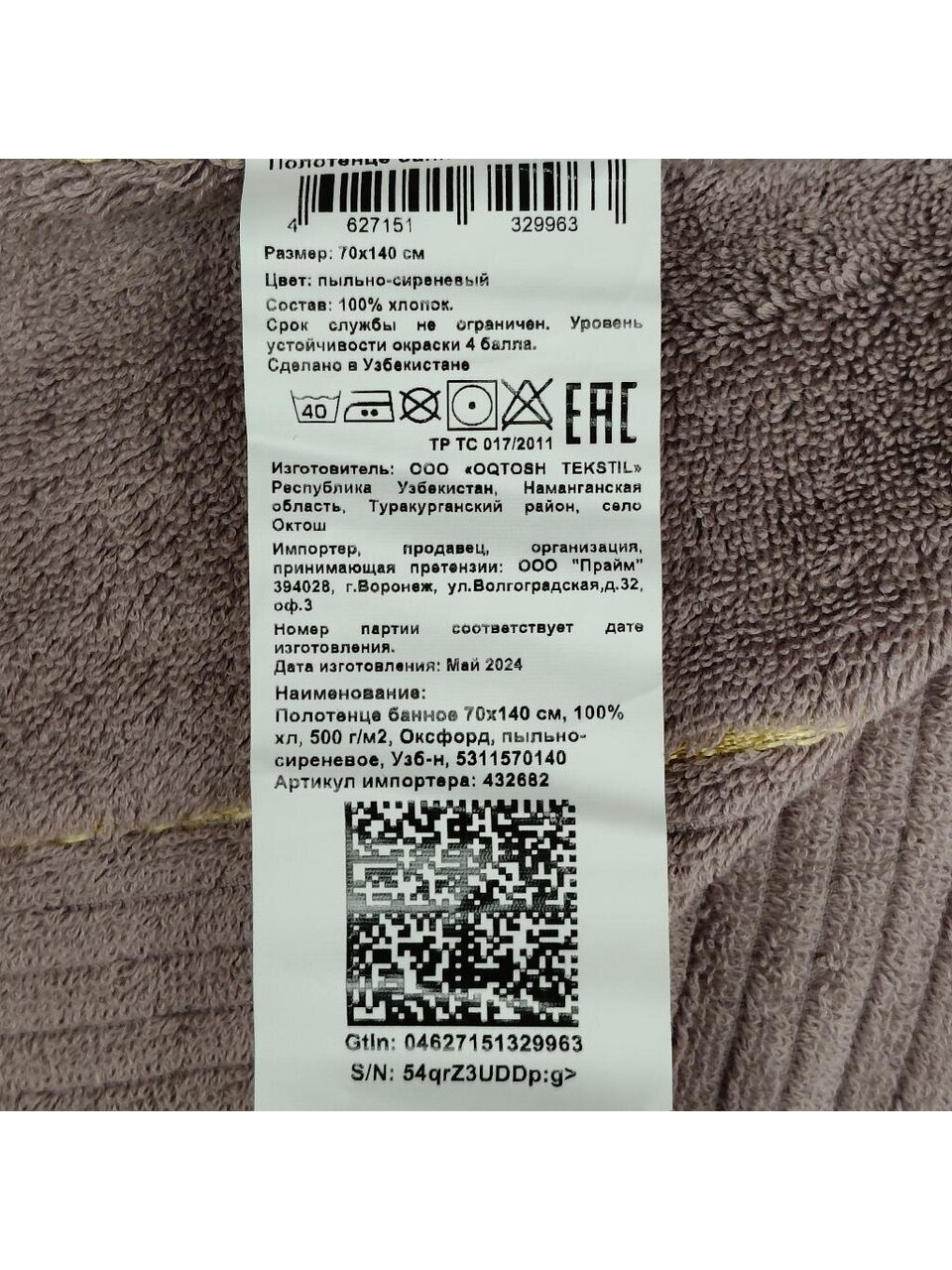 Вы можете приобрести «Полотенце банное 70х140 см, 100% хлопок, 500 г/м2, Оксфорд, пыльно-сиреневое, Узбекистан, 5311570140» и другие товары в нашем интернет-магазине в Смоленске по низким ценам и с бесплатным самовывозом.