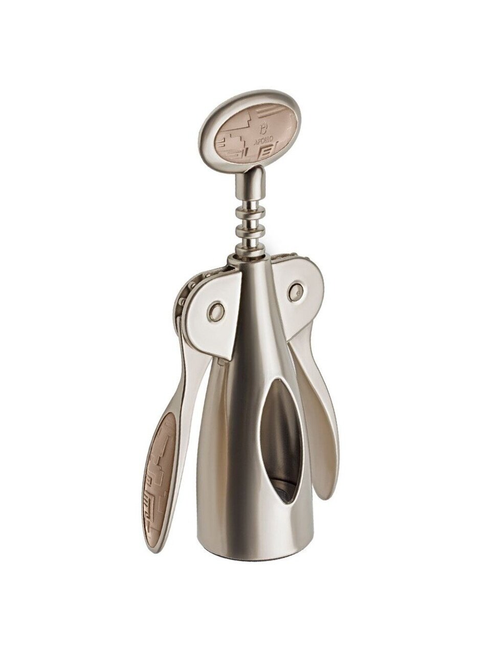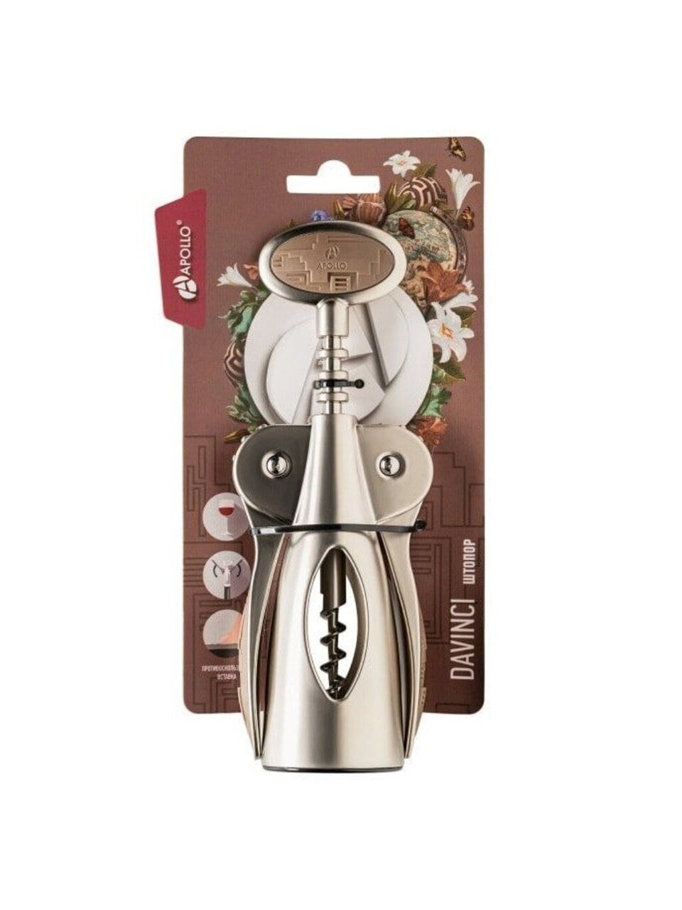 Штопор Apollo DaVinci позволяет извлекать пробки из бутылок в несколько простых действий. Благодаря конструкции с двумя рычагами и винтовым механизмом, процесс извлечения пробки не занимает много времени. Данное изделие изготовлено из цинкового сплава, что придает устойчивость к повреждениям и деформации. Материал также отличается хорошими антикоррозийными свойствами, поэтому штопор прослужит длительное время.