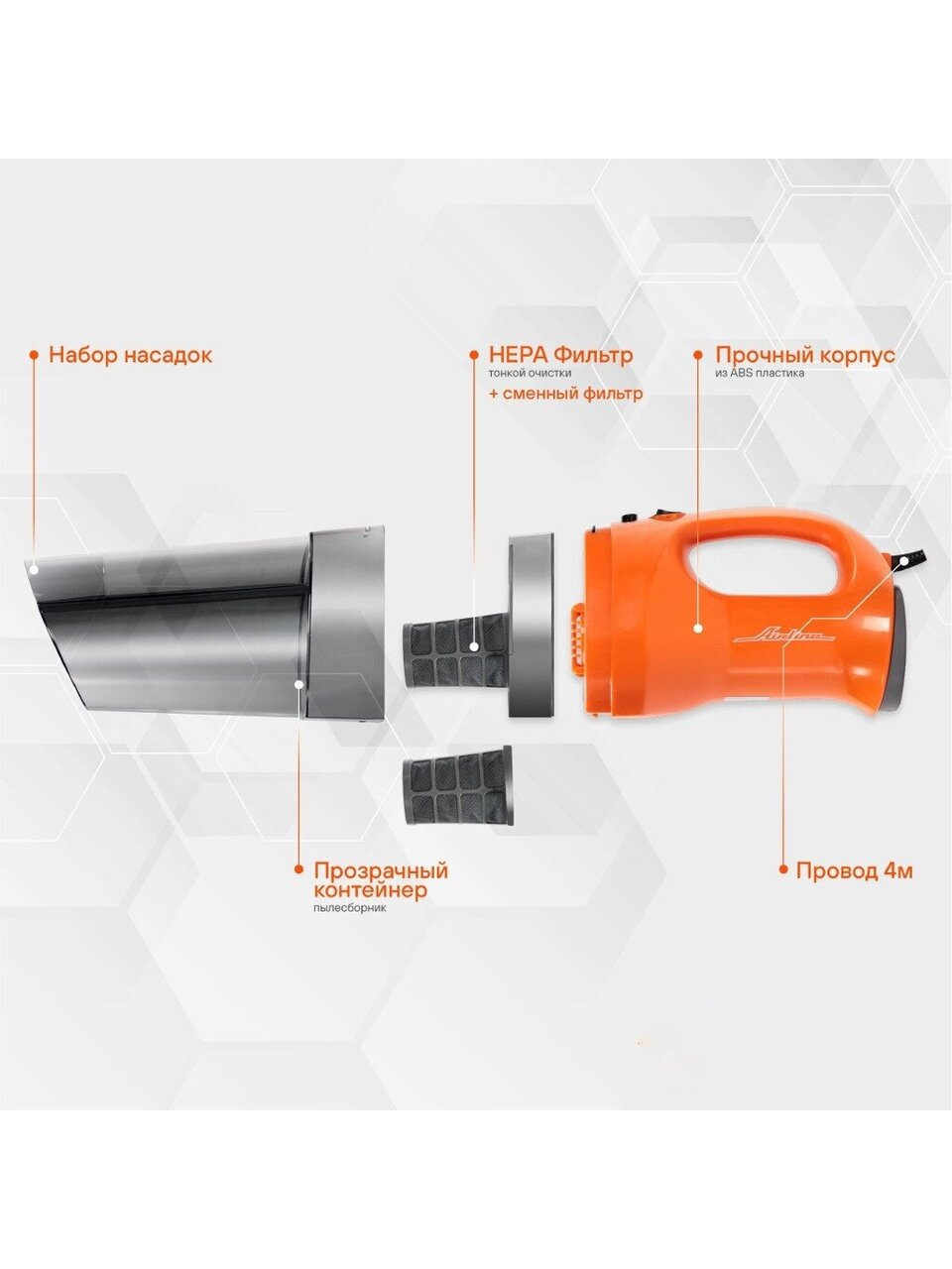 дополнительный съемный фильтр. - Длина кабеля питания от электросети автомобиля: 4 м.