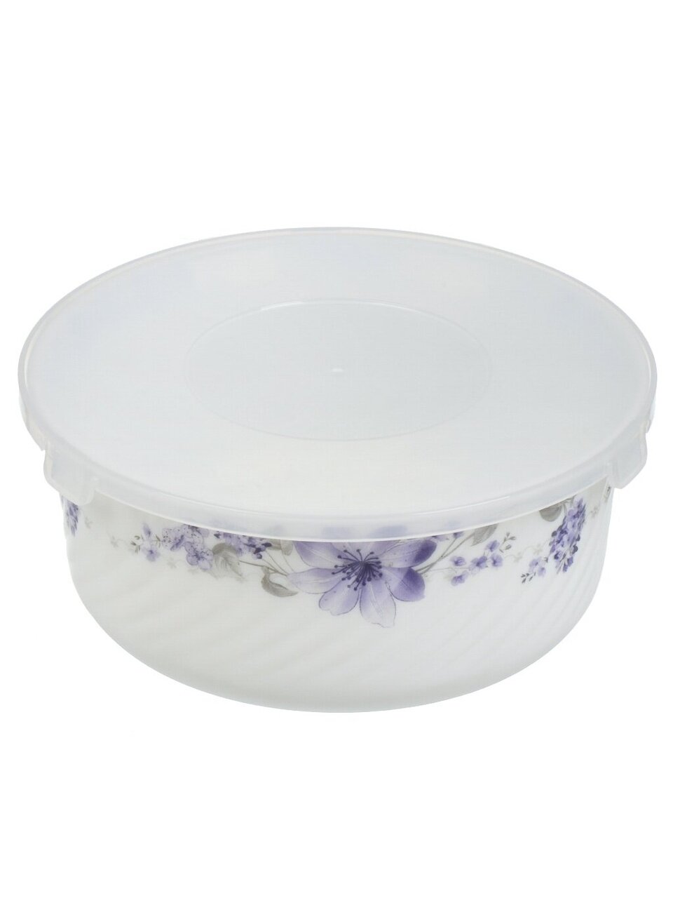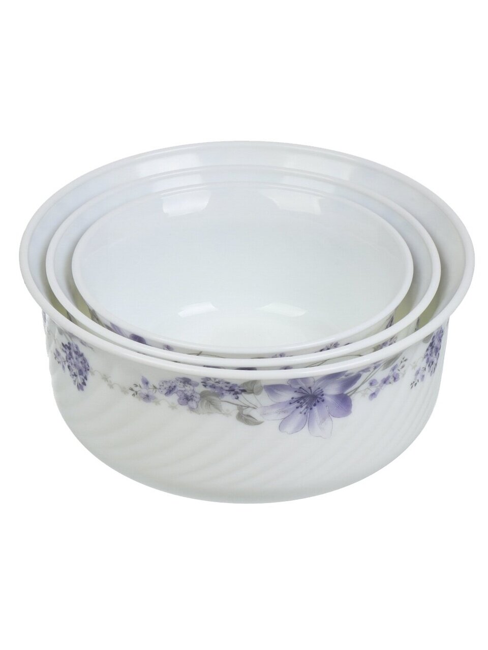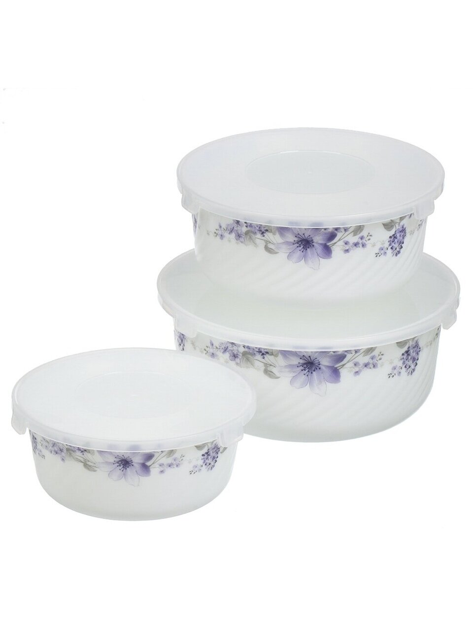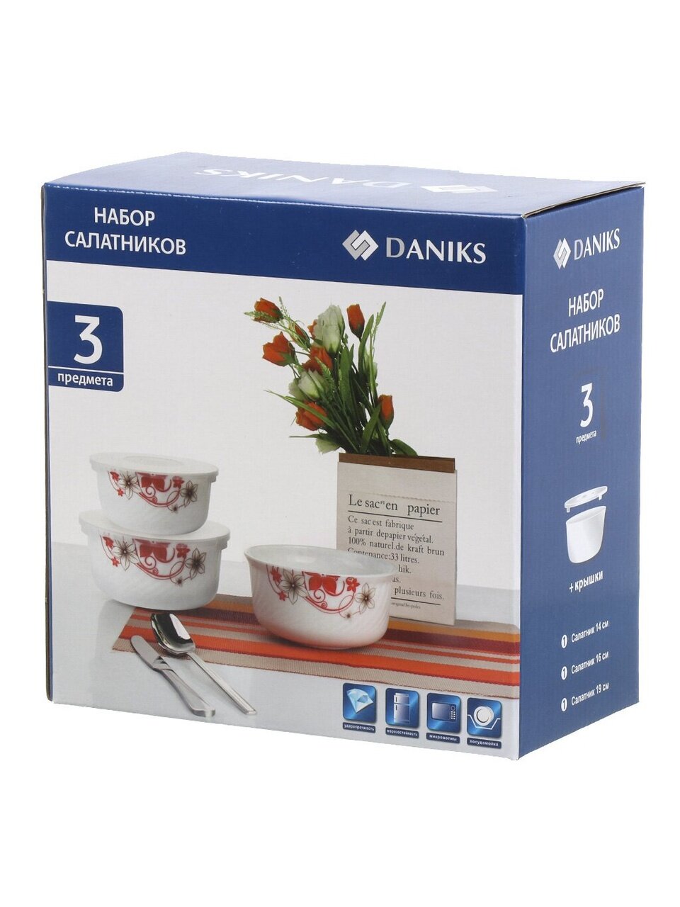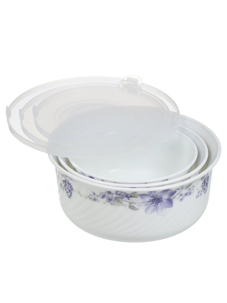 Салатники Daniks «Элегия» — набор из 3 круглых стеклокерамических мисок с крышками (0,5/0,8/1,4 л), белый цвет, стиль прованс. Идеальное решение для сервировки и хранения.