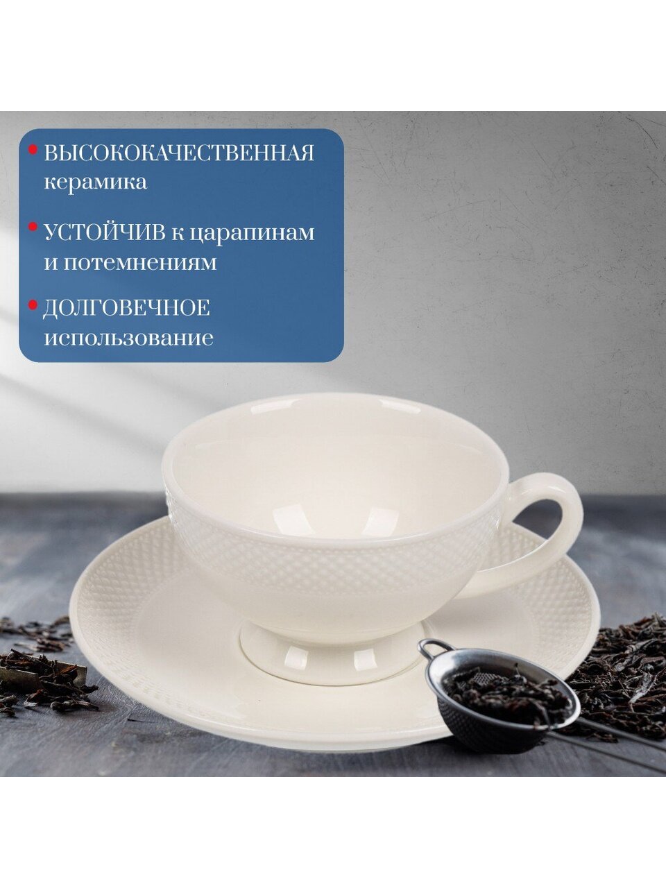 Чайный набор Daniks «Сеть» на 6 персон — идеальный выбор, если вы ищете, какой чайный сервиз купить недорого для дачи или уютного дома. Классический стиль, однотонный дизайн без рисунка и удобный объём чашек (240 мл) делают этот комплект универсальным для ежедневного использования и торжественных случаев. Керамика сохраняет температуру напитков дольше, чем стекло или фарфор, а прочность материала обеспечивает длительный срок службы.