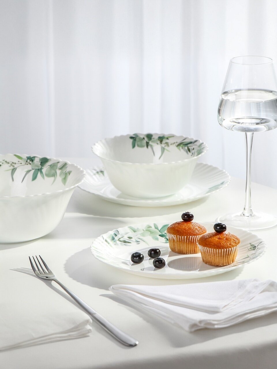 Сервиз столовый Daniks «Эвкалипт» — выбор тех, кто ищет прочную и эстетичную посуду для сервировки стола. Стеклокерамика устойчива к царапинам, не впитывает запахи и легко очищается, что особенно важно для семей с детьми и активного использования на даче. Благодаря универсальному белому цвету и изысканному декору сервиз гармонично впишется в любой интерьер — от классики до минимализма.