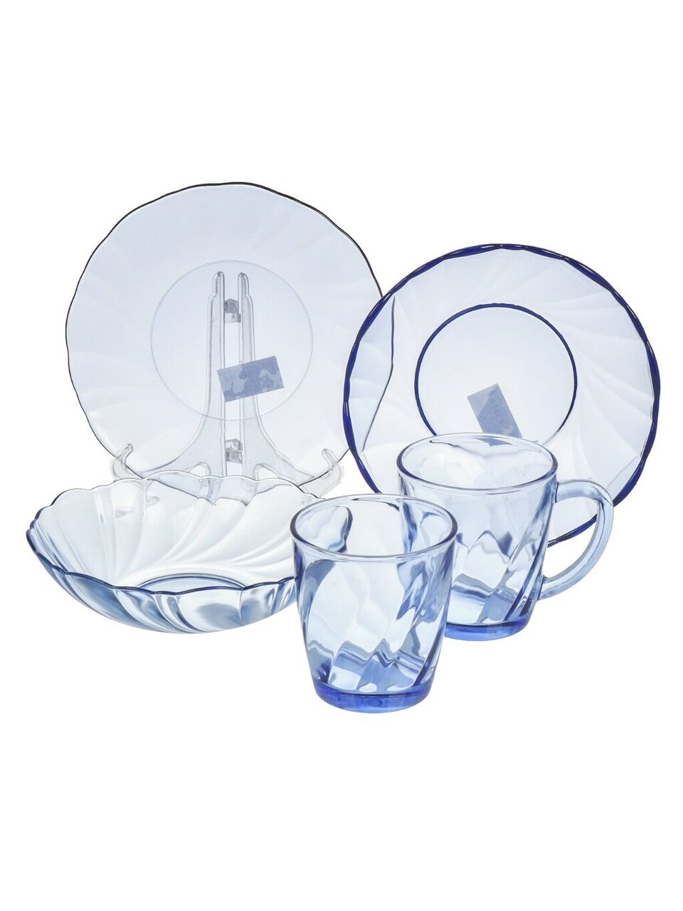 - 25 предметов из прочного стекла: 6 обеденных и суповых тарелок, 6 стаканов, 6 кружек, салатник — идеальный комплект на 6 персон