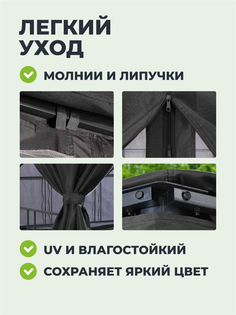 - Материал тента — крыша: полиэстер 160 г/м², боковые стенки: полиэстер 140 г/м² с сеткой.