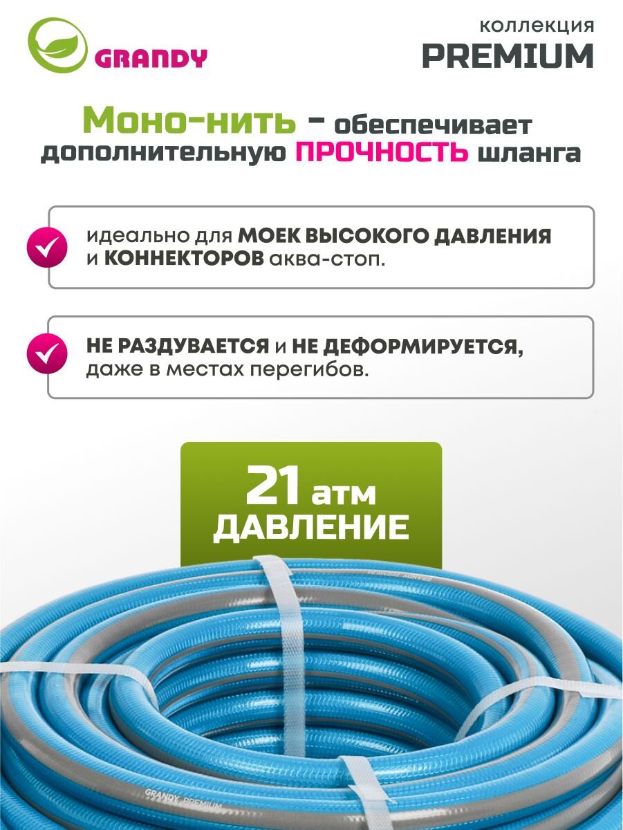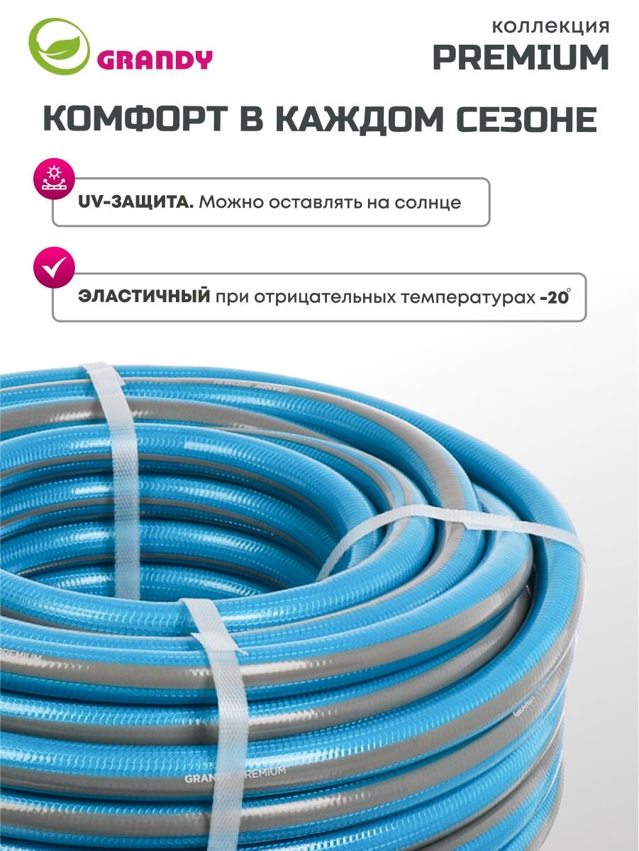 Шланг поливочный армированный Grandy Premium не подвержен локальным вздутиям, не образует трещин и изломов. Проверен на герметичность, концы шланга запаяны под давлением.