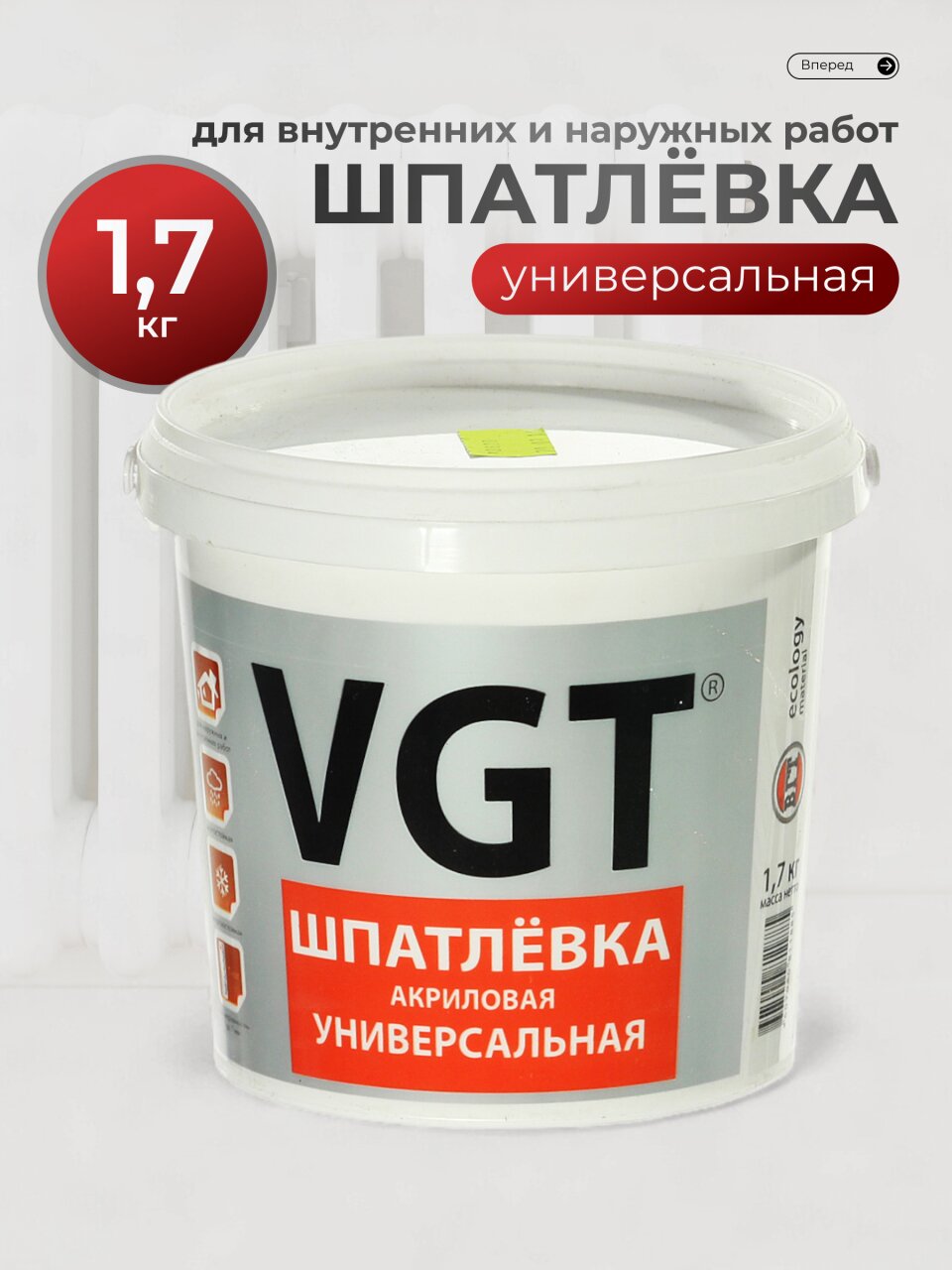 Вы можете приобрести «Шпатлевка VGT, акриловая, универсальная, 1.7 кг» и другие товары в нашем интернет-магазине в Иваново по низким ценам и с бесплатным самовывозом.