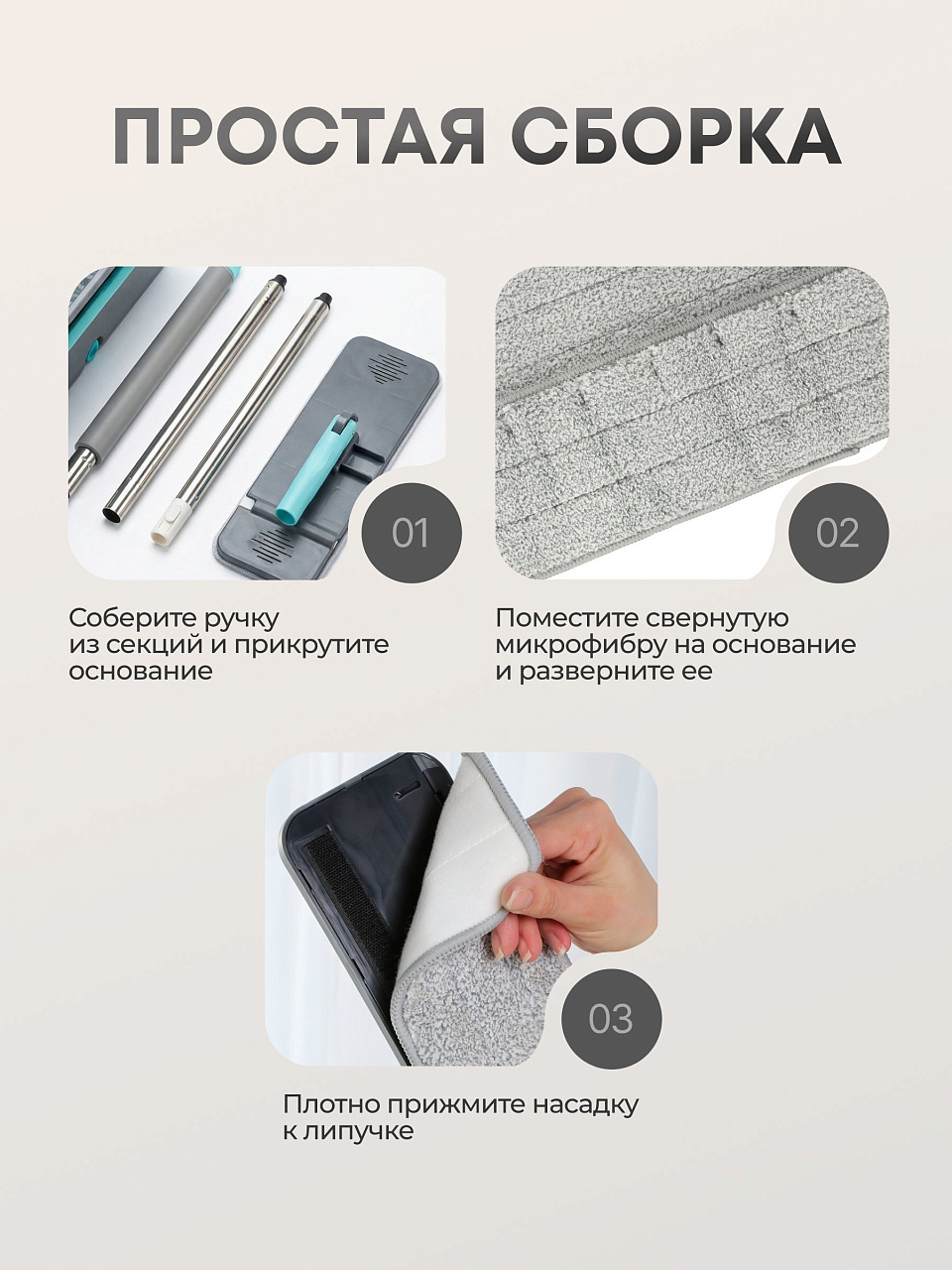 - Флаундерная система с магнитной фиксацией платформы: насадка надежно держится, не соскакивает при движении и позволяет легко менять микрофибру за секунды.