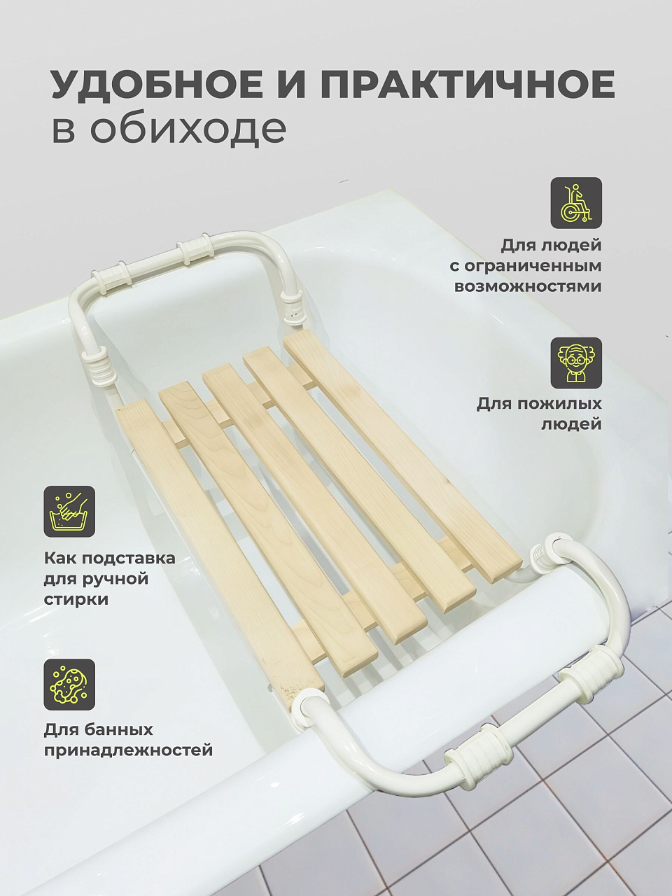 Пятиреечное сиденье из неокрашенного дерева, закрепленное к каркасу. Ручки выполнены из антискользящих материалов, обеспечивающих конструкции должную устойчивость. Регулируется по ширине ванны. Конструкция позволяет менять размер между опорами от 700 мм до 770 мм. Размер сиденья 285х670 мм. Максимальная нагрузка 100 кг.