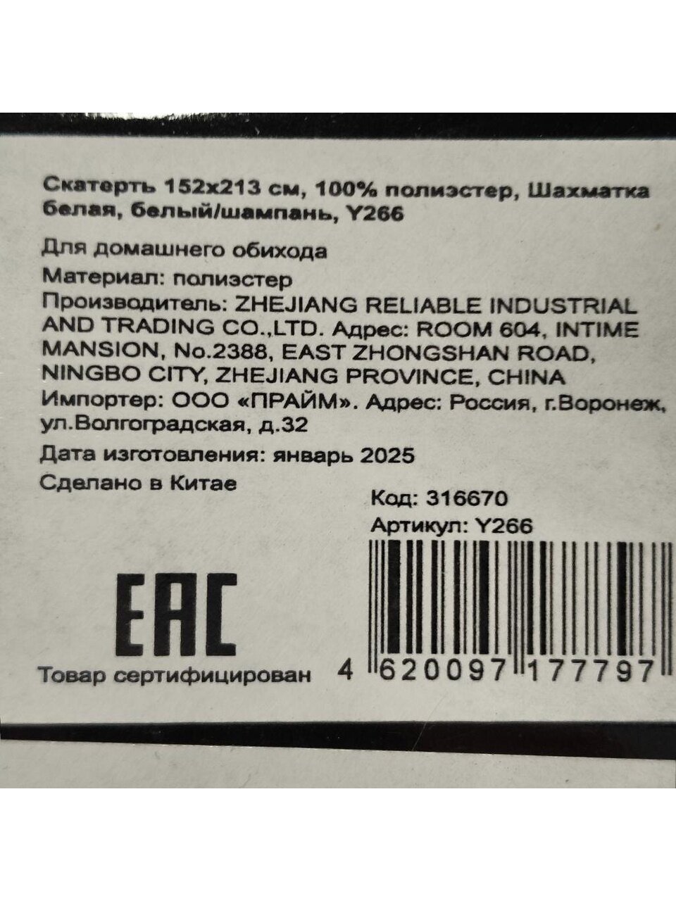Вы можете приобрести «Скатерть 152х213 см, 100% полиэстер, Шахматка белая, белый/шампань, Y266» и другие товары в нашем интернет-магазине в Смоленске по низким ценам и с бесплатным самовывозом.