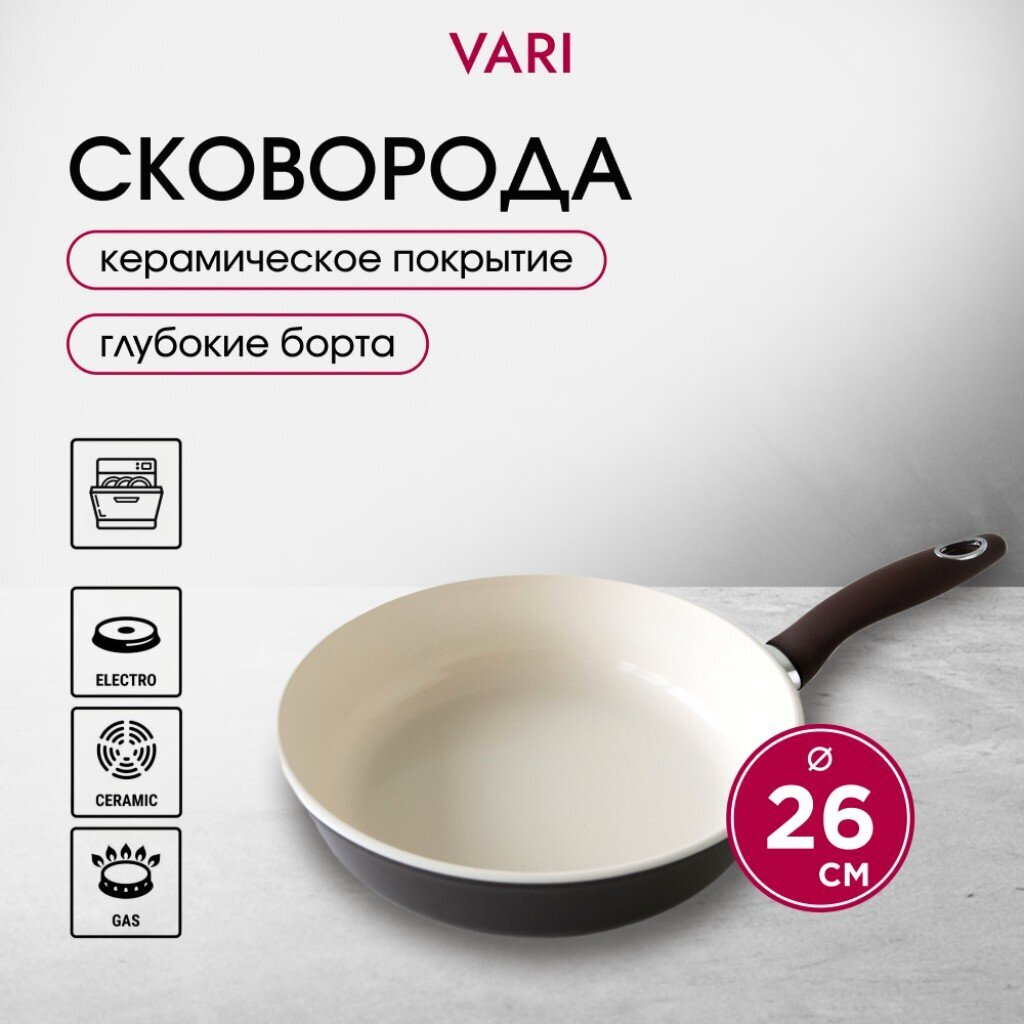 Чем отличается керамическая сковорода от классических моделей? Керамика экологична, не выделяет вредных веществ при нагреве, а толстое дно (6 мм) и борта (4,5 мм) позволяют использовать сковороду для жарки, тушения, запекания. Часто спрашивают: подходит ли эта сковорода для индукции? Нет, она совместима только с газовыми, электрическими и стеклокерамическими плитами. Для подарка эта сковорода — практичный выбор: стильный коричневый цвет, бренд Vari, гарантия 12 месяцев.