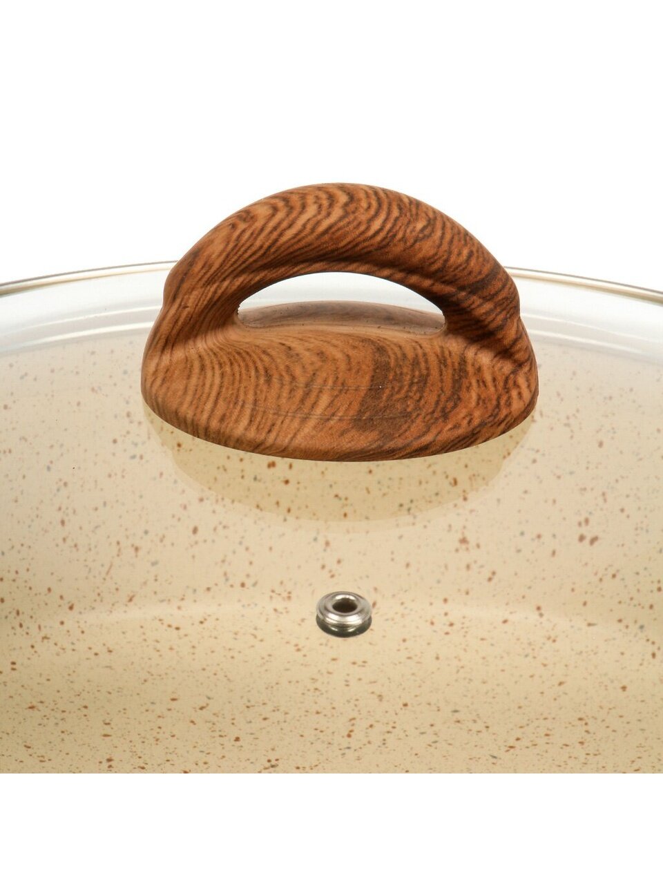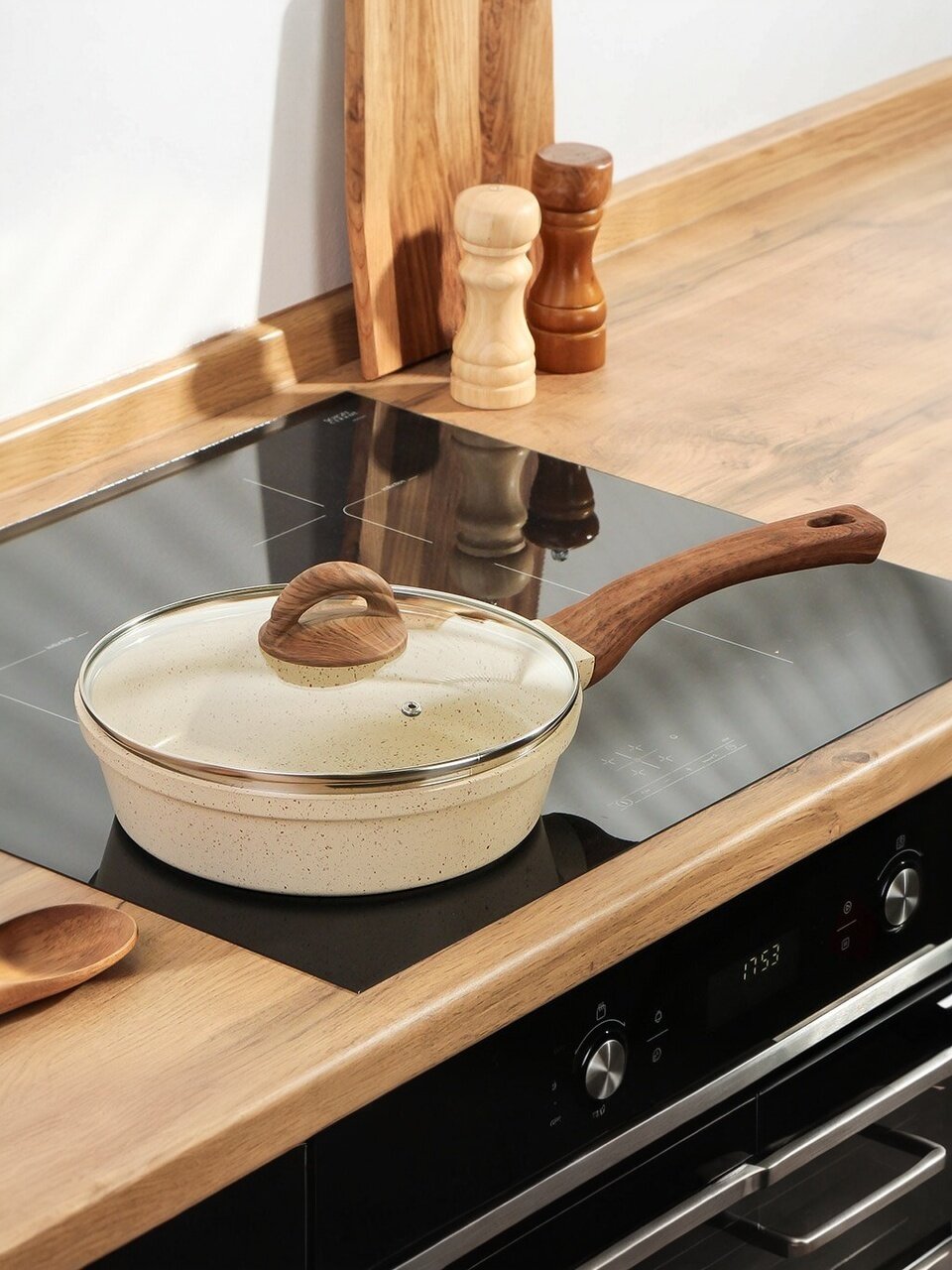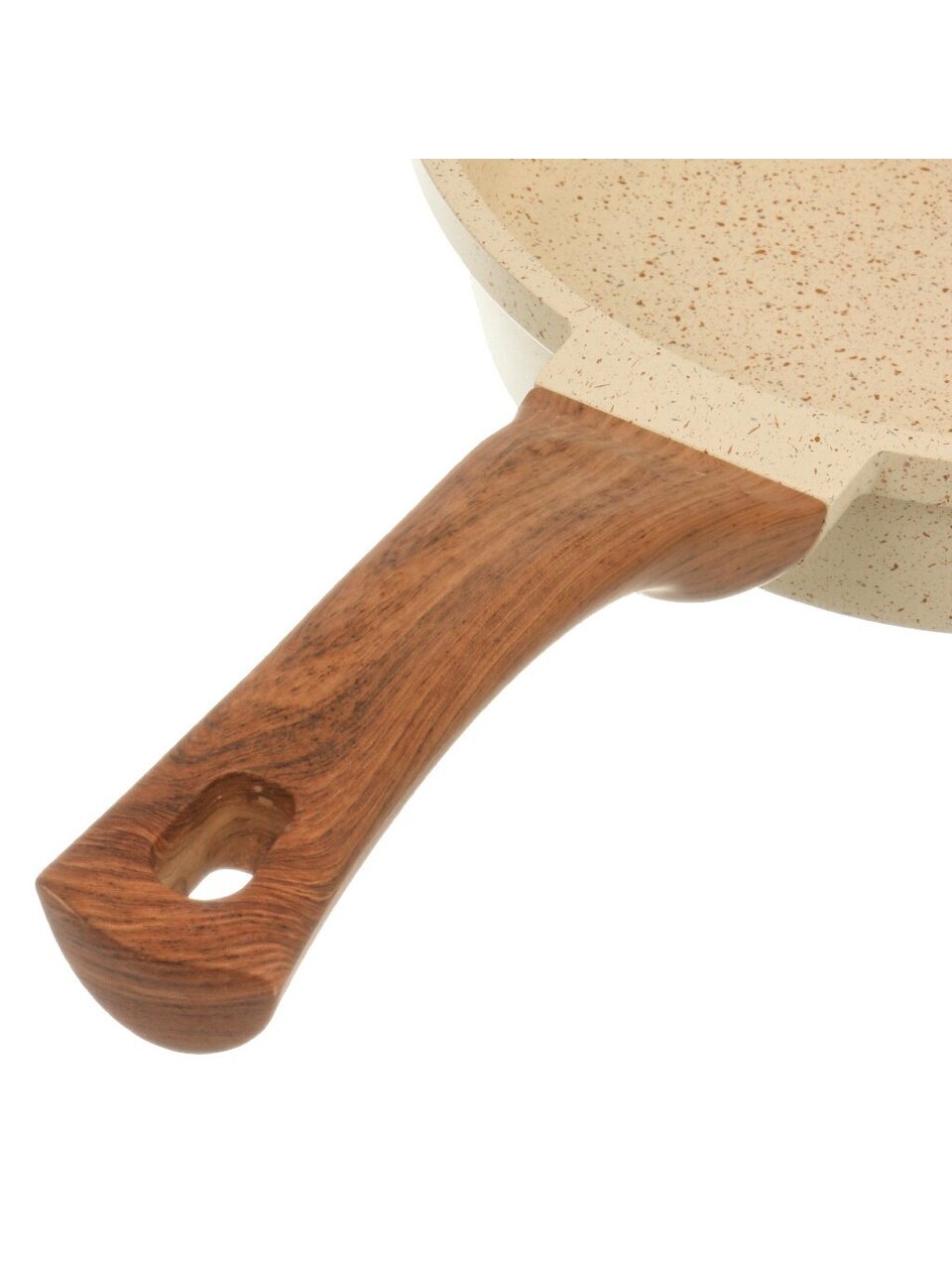 В отличие от бюджетных аналогов с тонким дном и простым покрытием, эта сковорода рассчитана на интенсивное ежедневное использование: литой алюминий не деформируется, а гранитное покрытие устойчиво к царапинам. Удобная крышка и эргономичная ручка делают приготовление комфортным. Часто спрашивают, подходит ли сковорода для подарка — благодаря стильной бежевой расцветке и фирменной коробке она станет отличным выбором для любого повода.