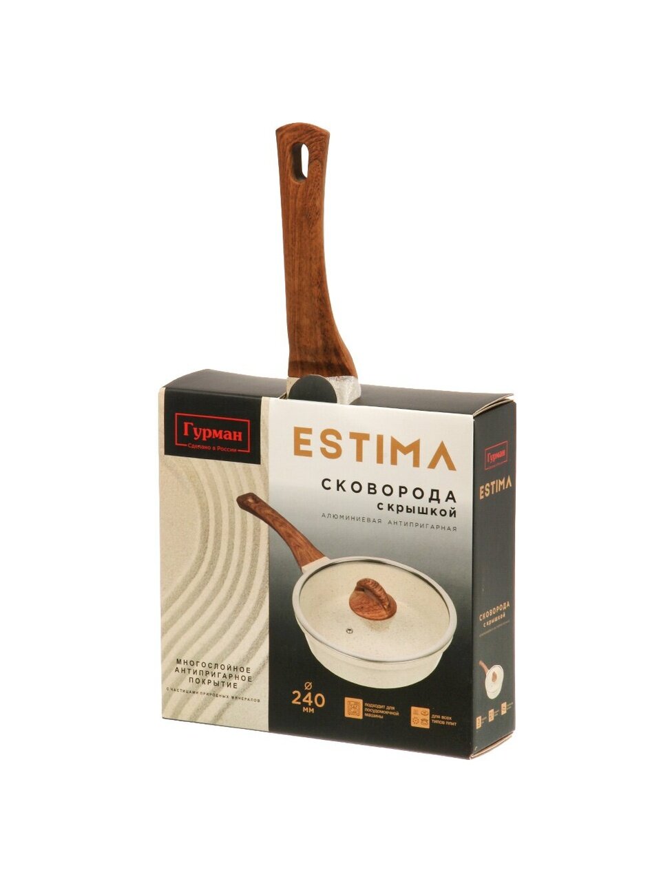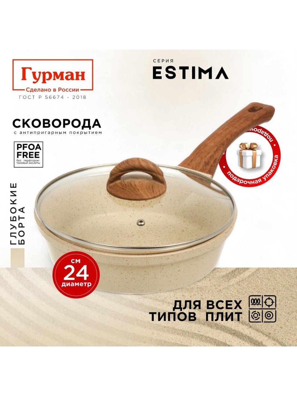 Вы можете приобрести «Сковорода литой алюминий, 24 см, антипригарное покрытие, Гурман, Estima, бежевая, с крышкой, в коробке, индукция, ГМ2402 ЭБИ» и другие товары в нашем интернет-магазине в Обнинске по низким ценам и с бесплатным самовывозом.