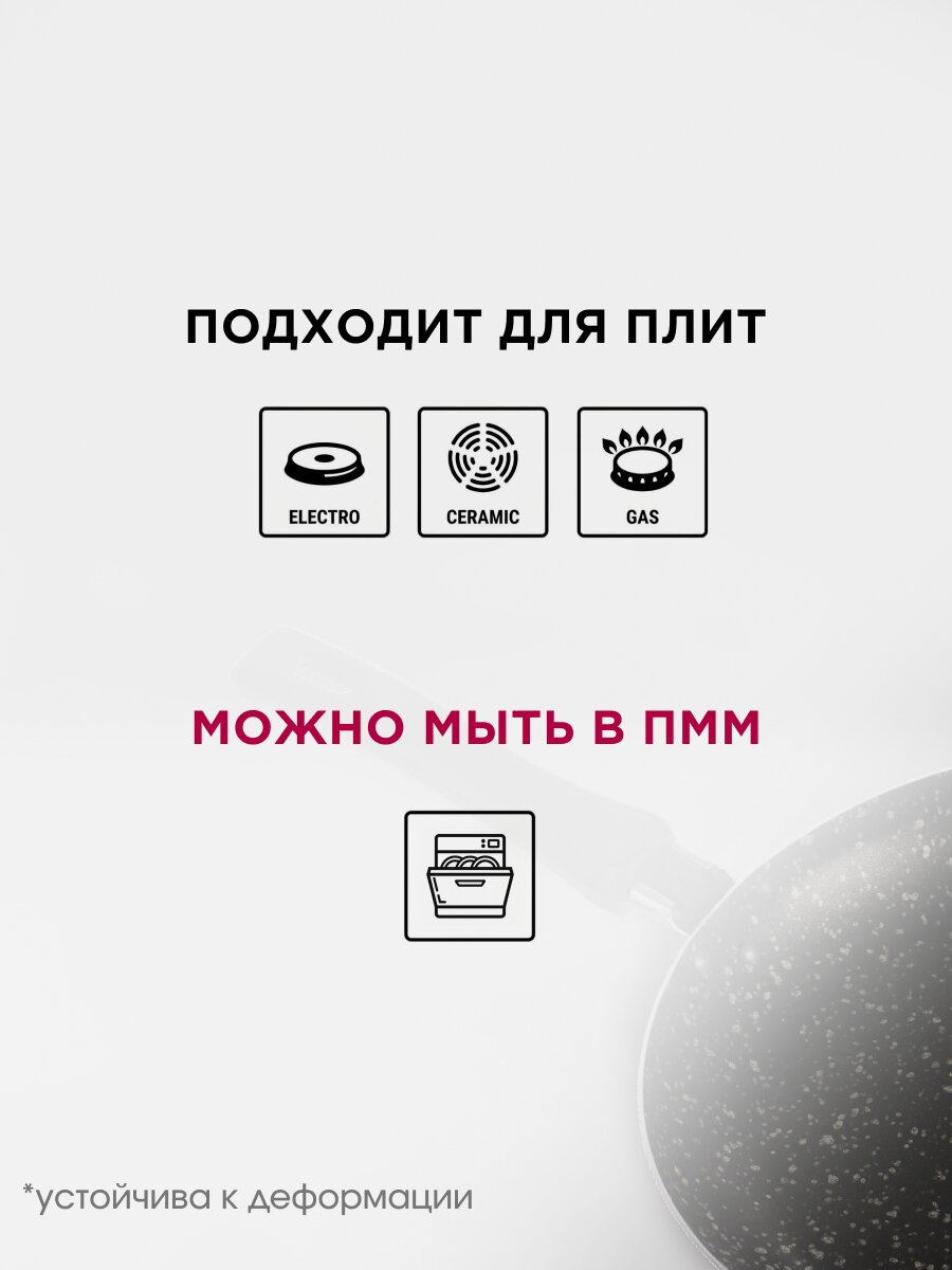 Как использовать такую сковороду? Подходит для любых рецептов: жарьте курицу, тушите овощи, делайте румяные блинчики. Благодаря высоте борта 63 мм и глубине удобно готовить как для одного, так и для всей семьи. Нет крышки в комплекте — подберите универсальную по диаметру 24 см. Не подходит для индукционных плит, зато отлично работает на газовых, электрических и стеклокерамических.